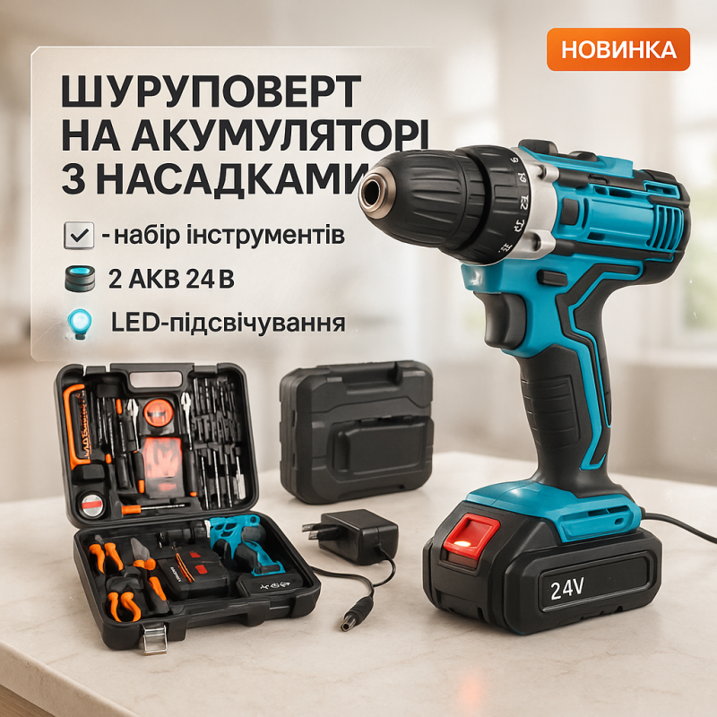 Акумуляторний дриль-шуруповерт 24 В — це багатофункціональний інструмент, який ідеально підійде для дому, майстерні або будівництва.