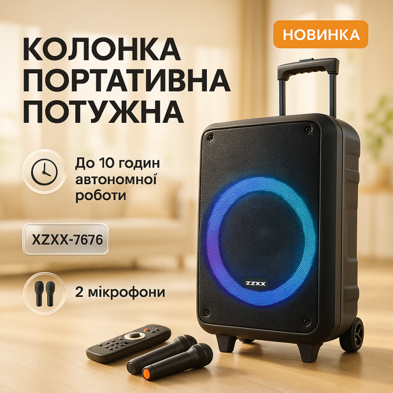 ZXX-7676 — відмінна колонка з потужним звуком, яскравим підсвічуванням та двома радіомікрофонами. Підключай Bluetooth або флешку, співай караоке та запалюй до 10 годин без розетки. Зручні коліщатка та ручка — бери із собою хоч на дачу!