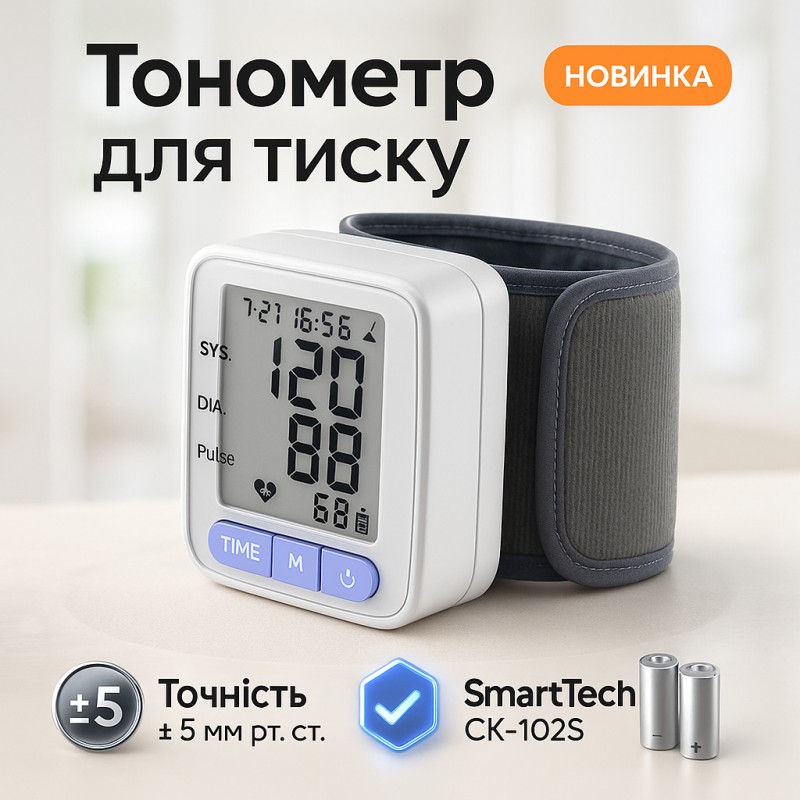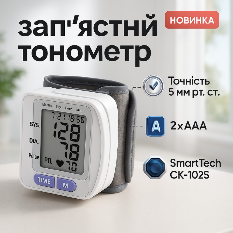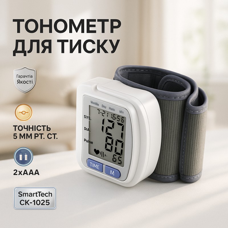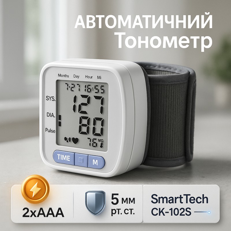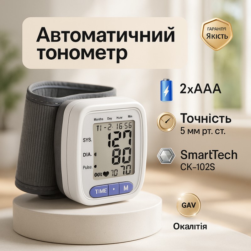 Автоматичний зап'ястний тонометр SmartTech CK-102S - це сучасний електронний прилад для вимірювання артеріального тиску. Він має компактний дизайн, легкий у використанні та забезпечує точні результати.