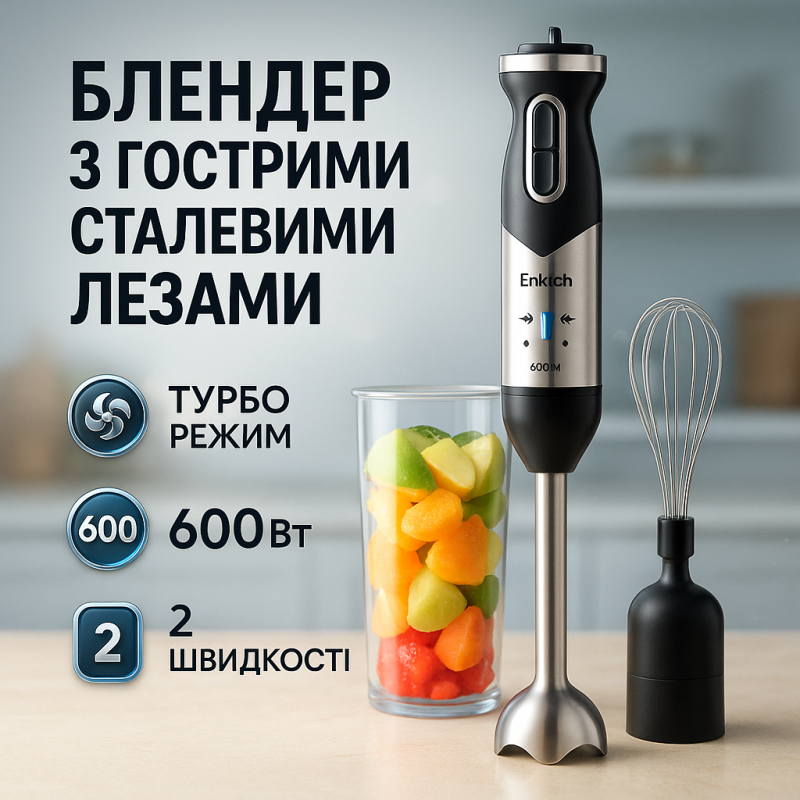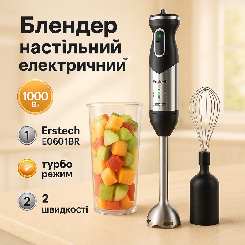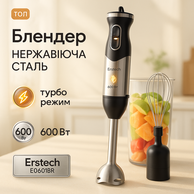Erstech E0601BR призначений для швидкого приготування різних кулінарних завдань у домашніх умовах. Він відмінно підходить для подрібнення фруктів і овочів, приготування смузі, соусів, кремів та супів-пюре. Турбо-режим дозволяє зробити текстуру більш однорідною, що особливо важливо для десертів або дитячого харчування. Можливість збивання за допомогою венчика розширює функціонал – з його допомогою легко приготувати повітряні креми та омлети. Компактні розміри і вага всього 0,96 кг роблять пристрій зручним для використання навіть у невеликій кухні, а знімні частини із можливістю миття у посудомийній машині економлять ваш час на прибирання.
