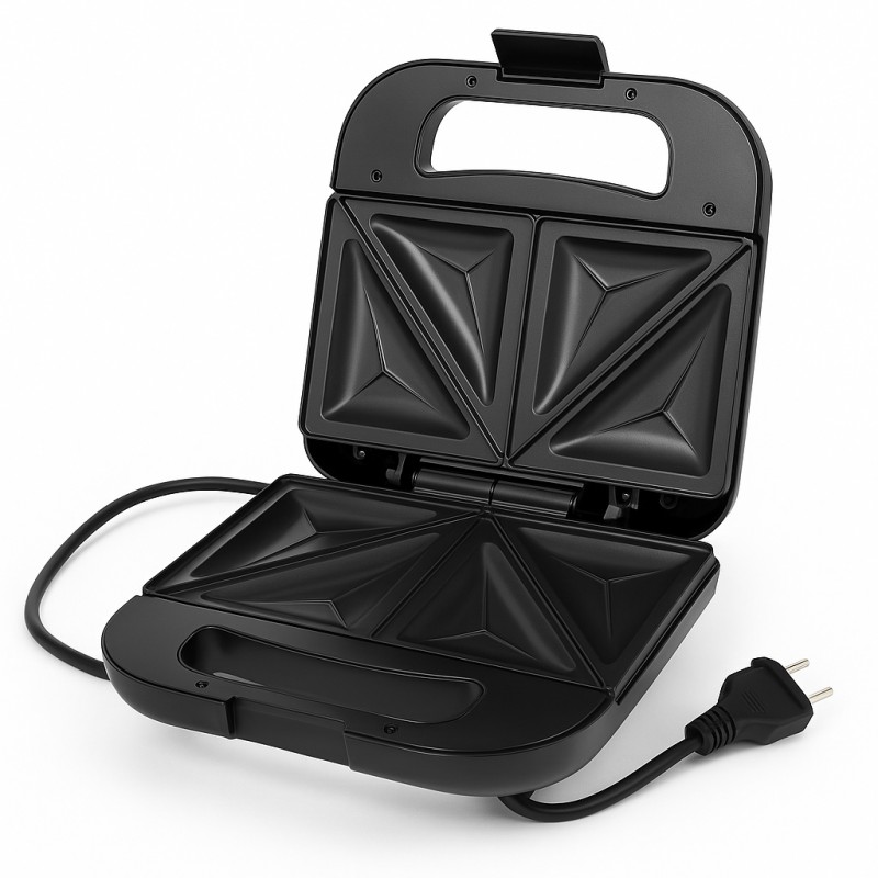 Корпус изготовлен из высококлассного термостойкого пластика черного цвета. Тип противня – поджаренный сэндвич в форме треугольников.