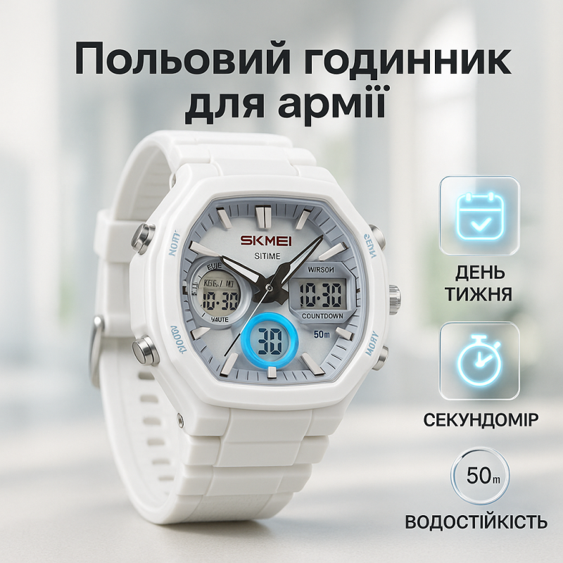 SKMEI 2389WT — это стильные и многофункциональные часы, объединяющие цифровые технологии с классическим аналоговым отображением времени. Он рассчитан на активных людей, ценящих комфорт, точность и привлекательный внешний вид. Благодаря трем временным зонам и широкому набору функций, модель отлично подойдет для повседневной носки или путешествий.