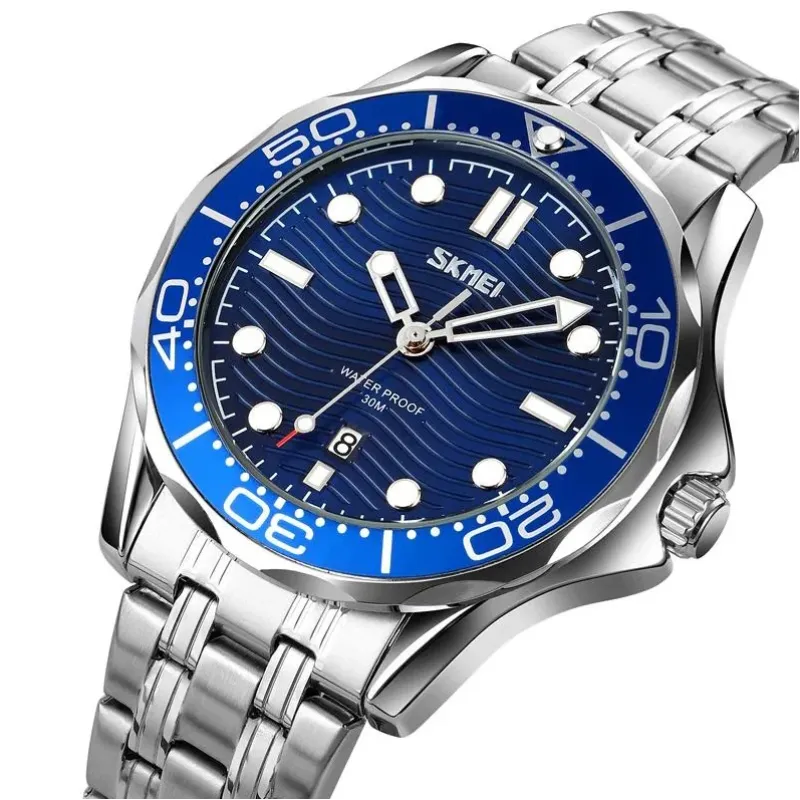 SKMEI 9276SSIBU – это яркий пример сочетания классического дайверского стиля и современного дизайна. Часы имеют глубокий синий циферблат с волнистой текстурой, что придает ему динамичность и визуальную глубину. Большие метки с люминесцентным покрытием, вращающийся безель и крепкий металлический браслет формируют образ надежного и стильного аксессуара для мужчин, которые ценят практичность и эстетику.