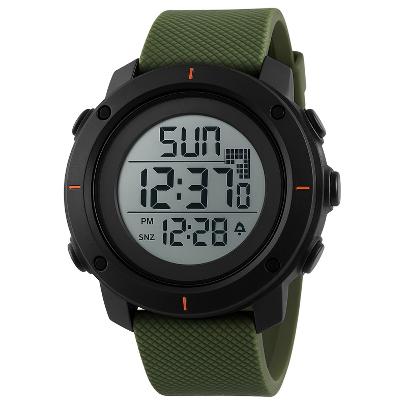 SKMEI 1213AG ARMY GREEN — это надежные цифровые часы в милитаре-стиле, идеально сочетающие строгий дизайн и практические функции. Модель выполнена в защитном зеленом цвете с черным корпусом и оранжевыми метками на безели, придающими характер и узнаваемость. Большой экран обеспечивает легкое считывание информации даже в движении или в условиях недостаточного освещения.
