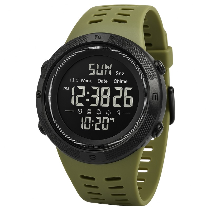 Часы SKMEI 2070AG ARMY GREEN — это современная модель в стиле «милитари», созданная для тех, кто ценит надежность, удобство и спортивный вид. Большой круглый дисплей с четкой цифровой индикацией обеспечивает удобное считывание информации даже в движении или при слабом освещении. Черный корпус с фактурным безелем и матовый ремешок цвета хаки идеально сочетаются в образе настоящих тактических часов.