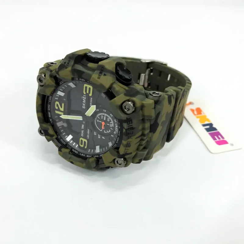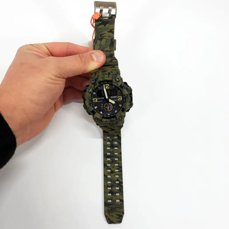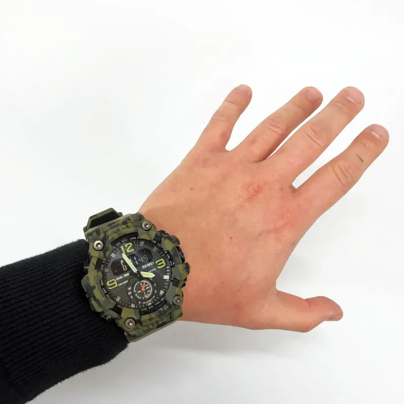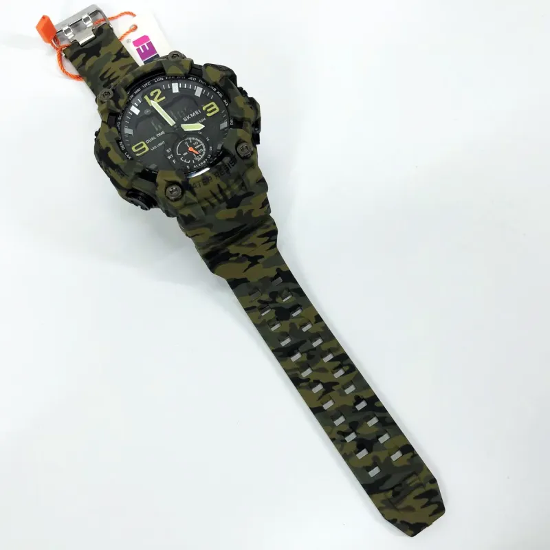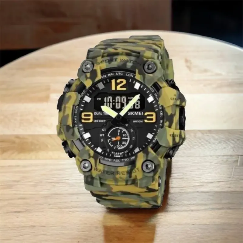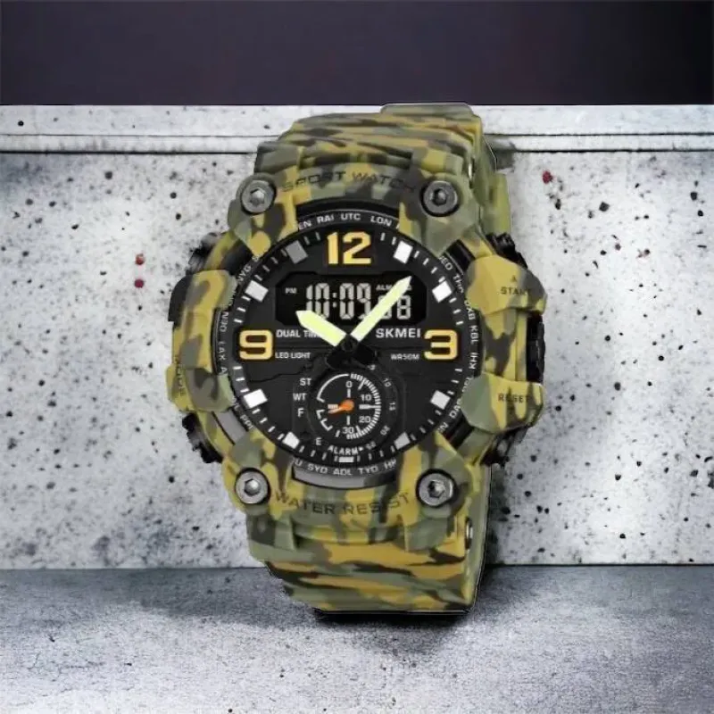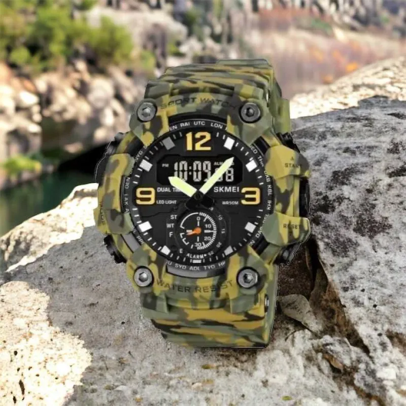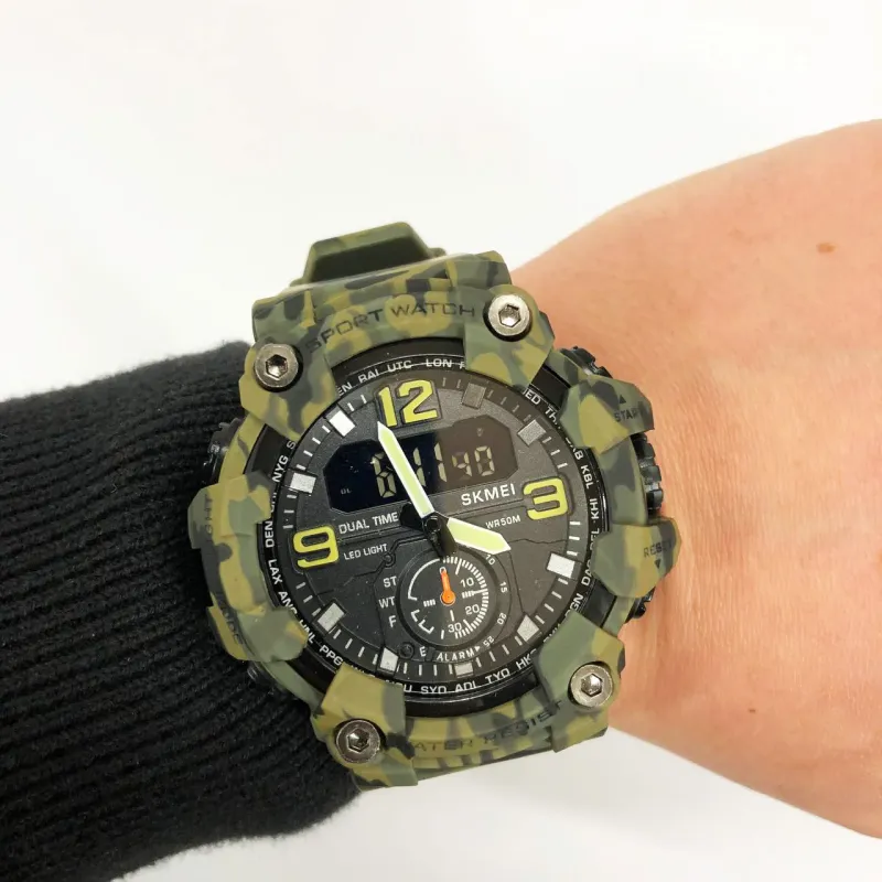 Наручные часы SKMEI 1965CMGN CAMO GREEN – это надежная спортивная модель в стильном камуфляжном дизайне, созданная для активного образа жизни. Массивный корпус и ремешок в цвет камуфляж придают часам брутальный вид, а комбинированный циферблат позволяет одновременно использовать аналоговое и цифровое отображение времени.