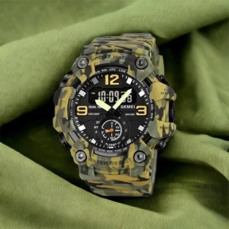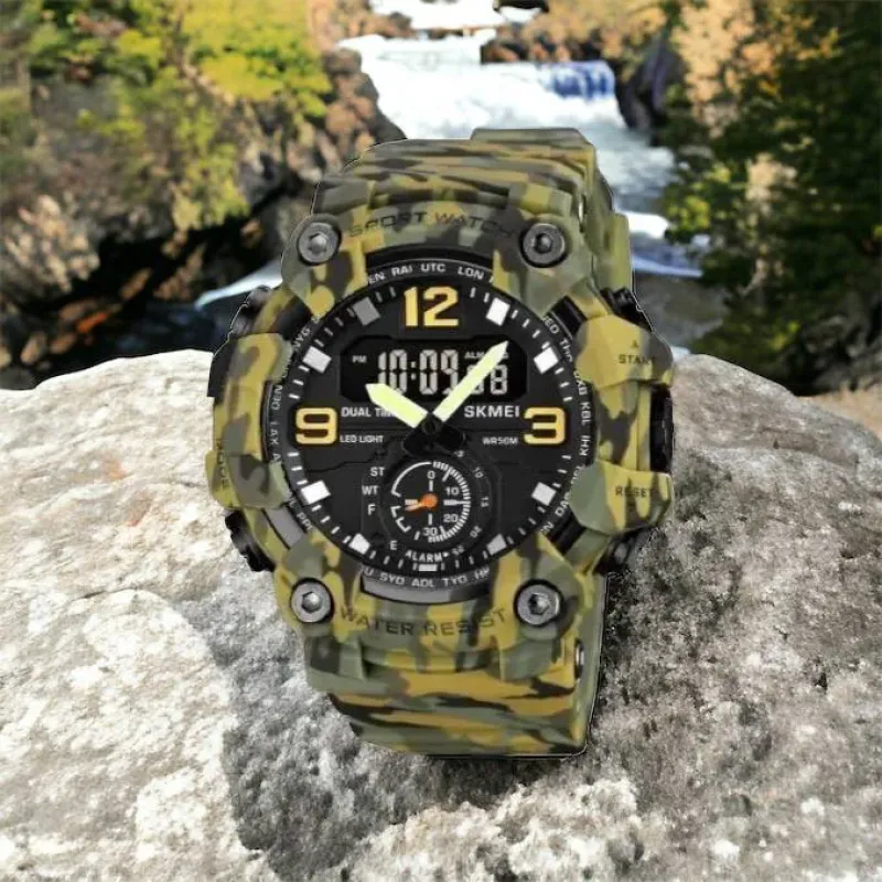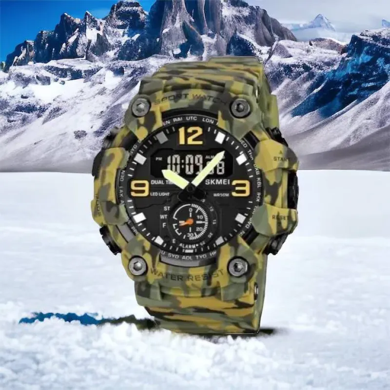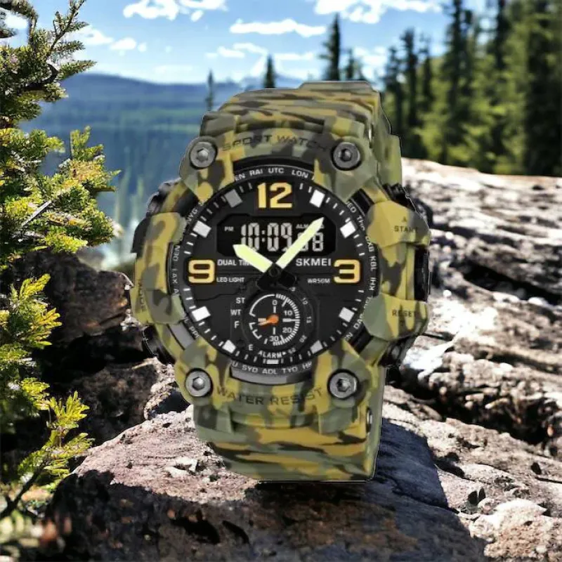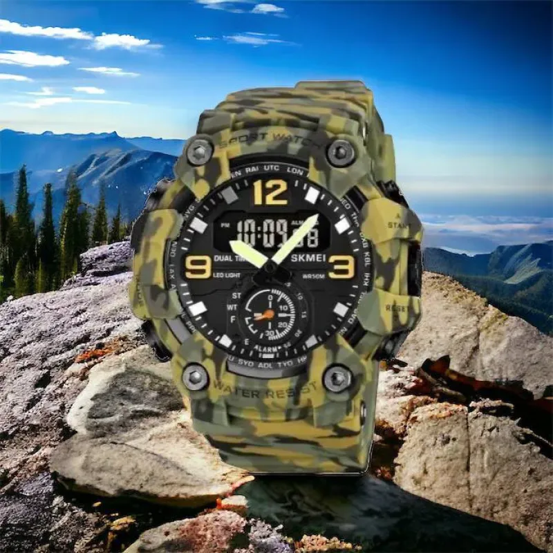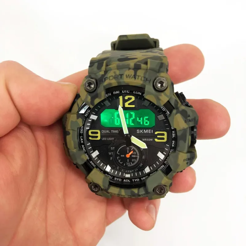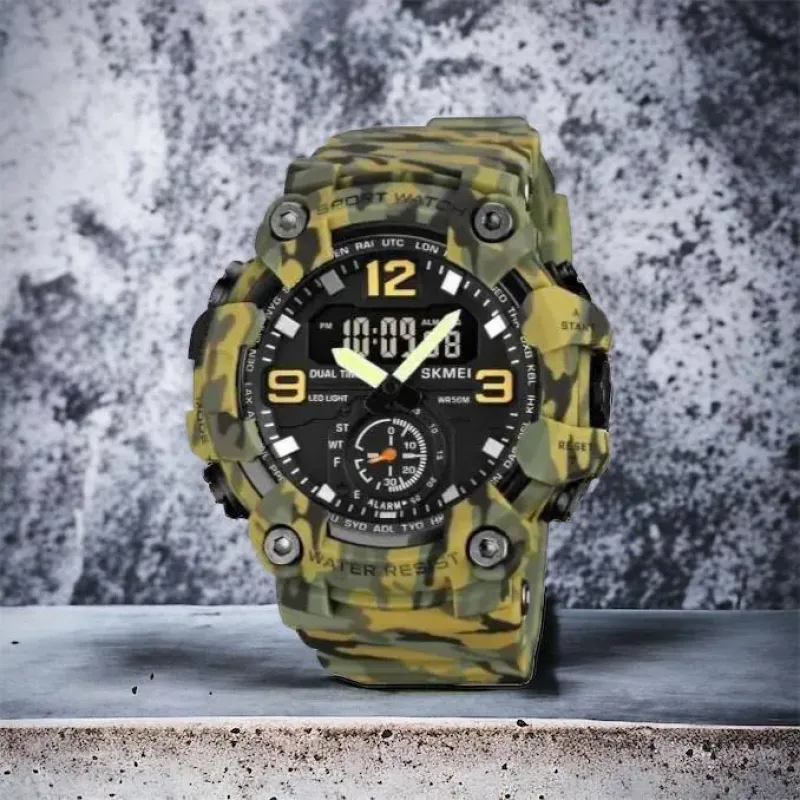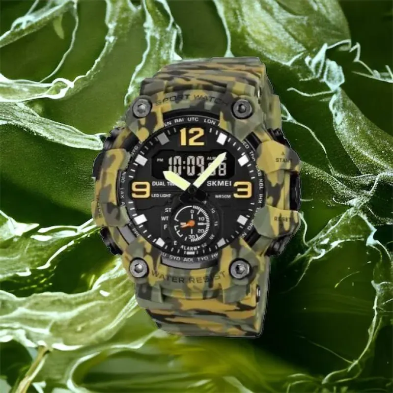 Наручные часы SKMEI 1965CMGN CAMO GREEN – это надежная спортивная модель в стильном камуфляжном дизайне, созданная для активного образа жизни. Массивный корпус и ремешок в цвет камуфляж придают часам брутальный вид, а комбинированный циферблат позволяет одновременно использовать аналоговое и цифровое отображение времени.