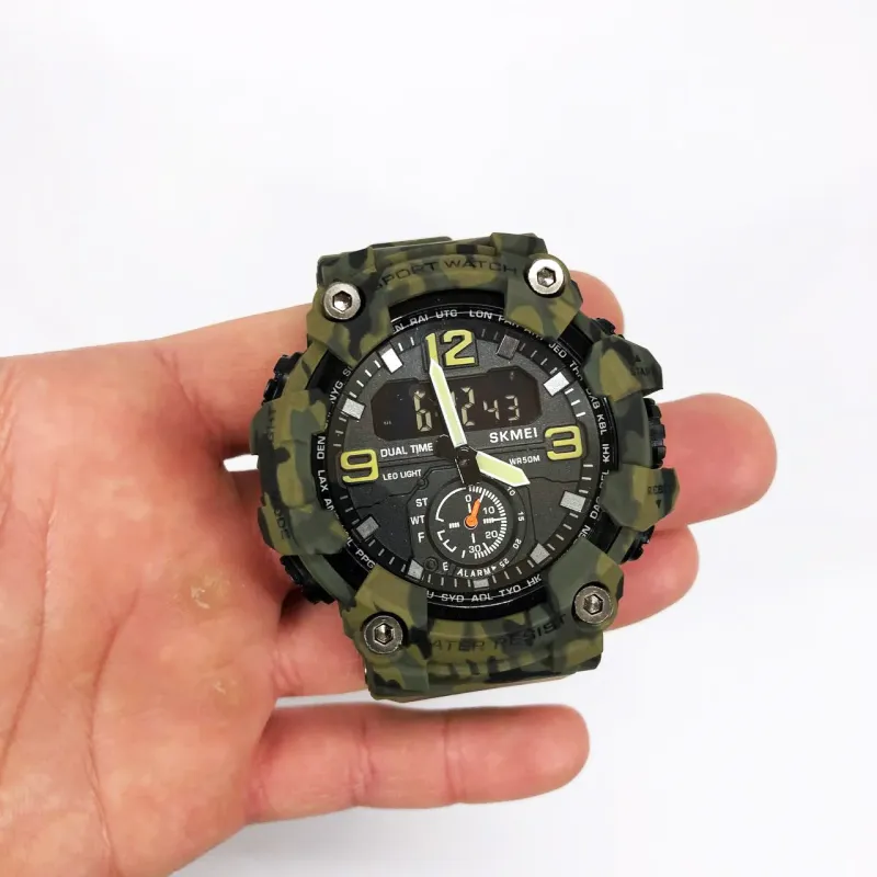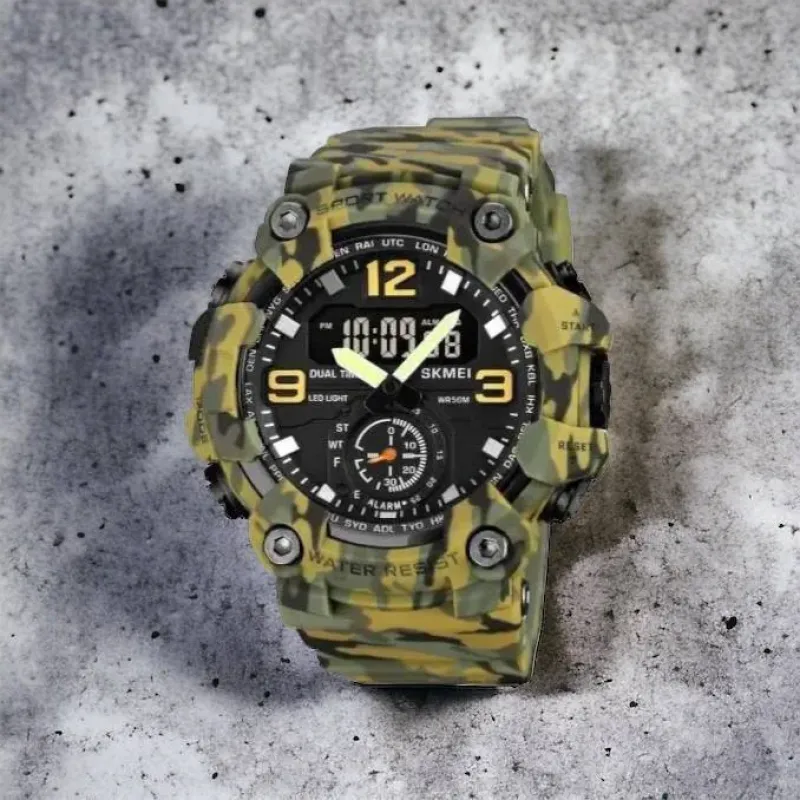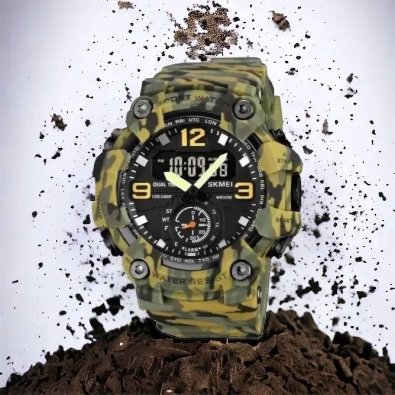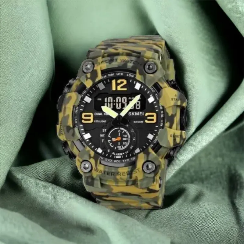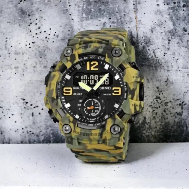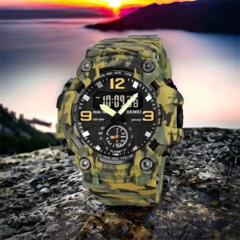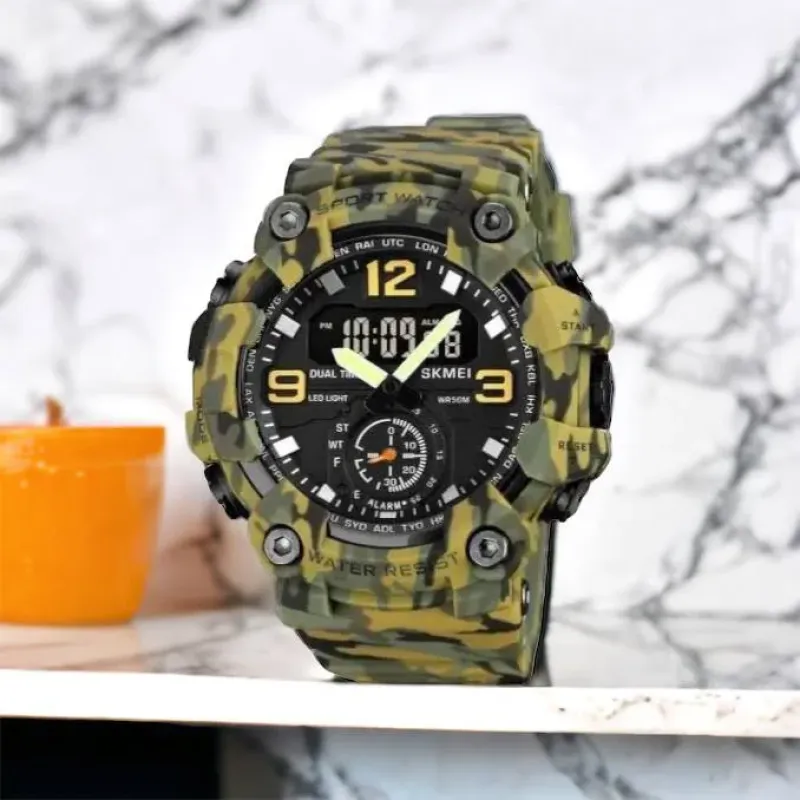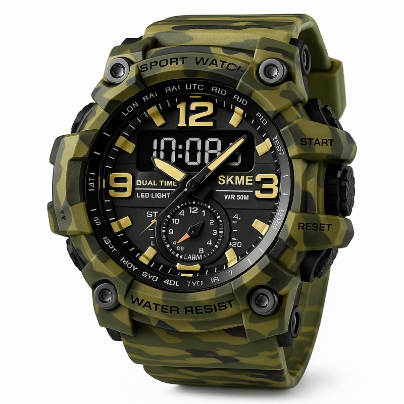 Наручные часы SKMEI 1965CMGN CAMO GREEN – это надежная спортивная модель в стильном камуфляжном дизайне, созданная для активного образа жизни. Массивный корпус и ремешок в цвет камуфляж придают часам брутальный вид, а комбинированный циферблат позволяет одновременно использовать аналоговое и цифровое отображение времени.