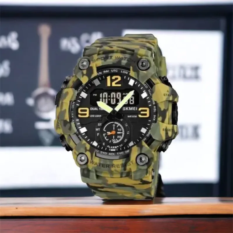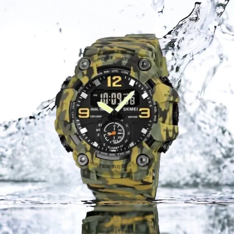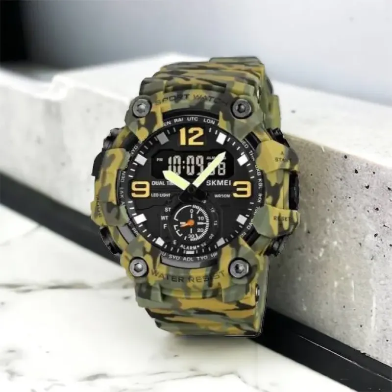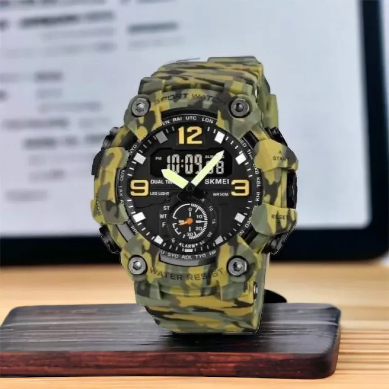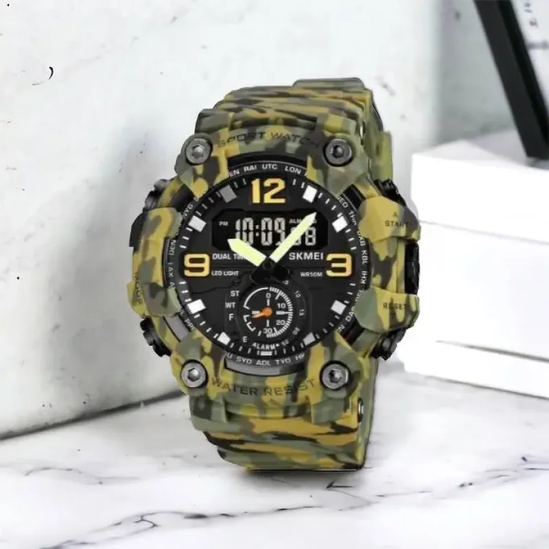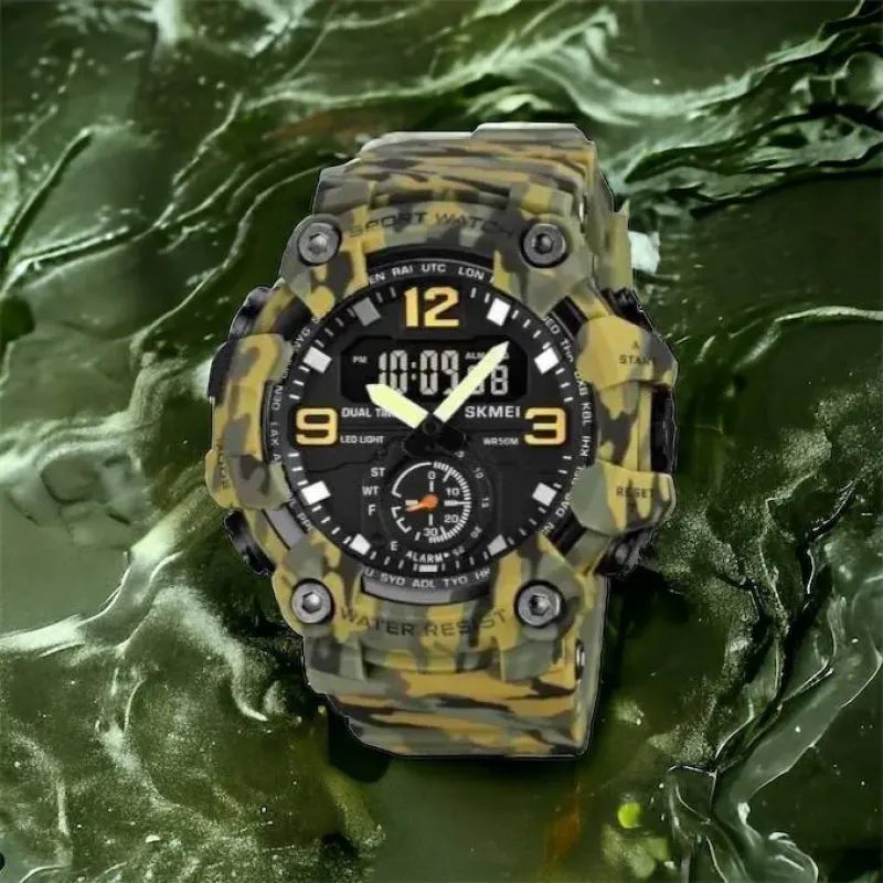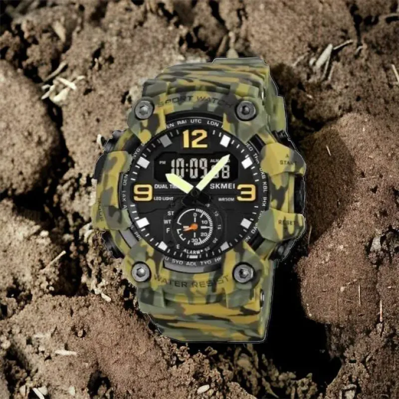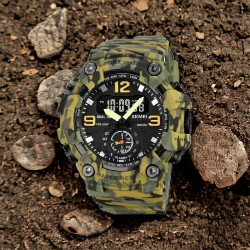 Наручные часы SKMEI 1965CMGN CAMO GREEN – это надежная спортивная модель в стильном камуфляжном дизайне, созданная для активного образа жизни. Массивный корпус и ремешок в цвет камуфляж придают часам брутальный вид, а комбинированный циферблат позволяет одновременно использовать аналоговое и цифровое отображение времени.
