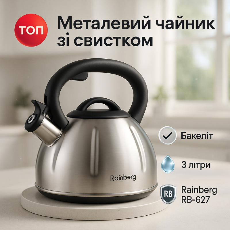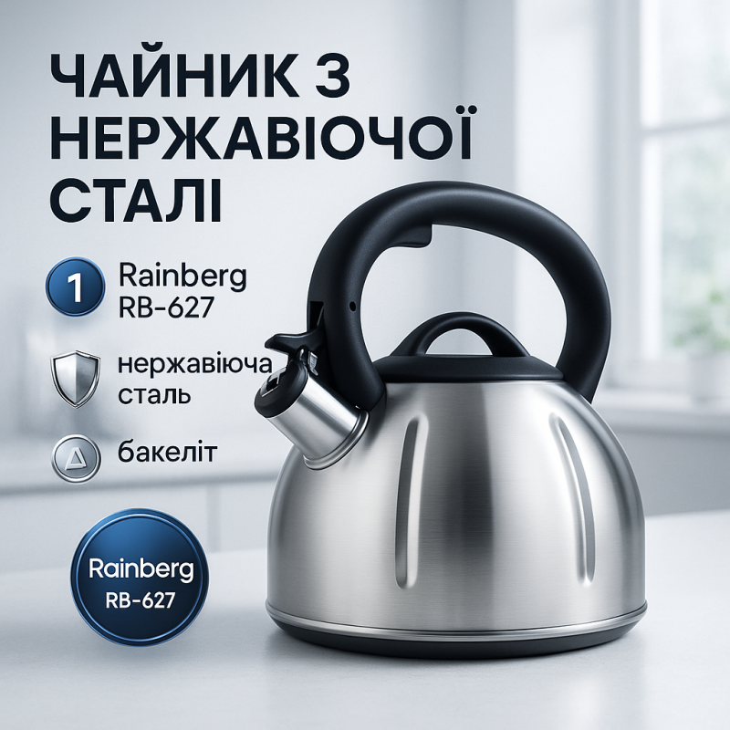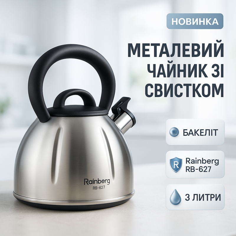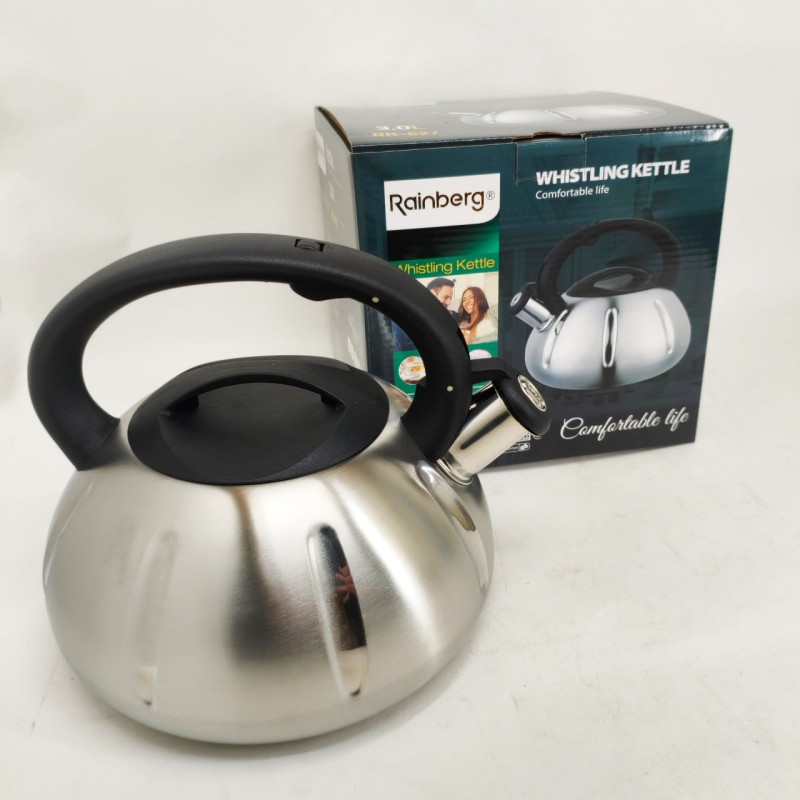 | Назва | Чайник із нержавіючої сталі зі свистком Rainberg RB-627 об'ємом 3 л |