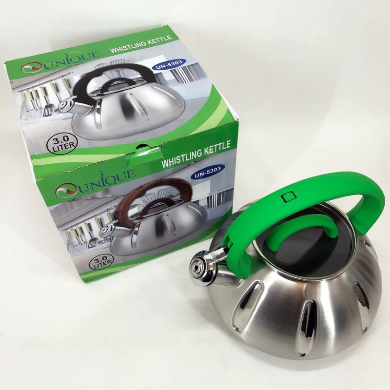 | Назва | Чайник із свистком Unique UN-5303 кухонний на 3 літри, Чайник нержавіючий зі свистком. Колір: зелений |