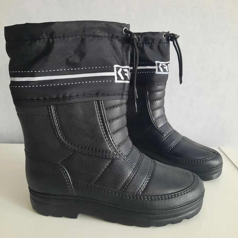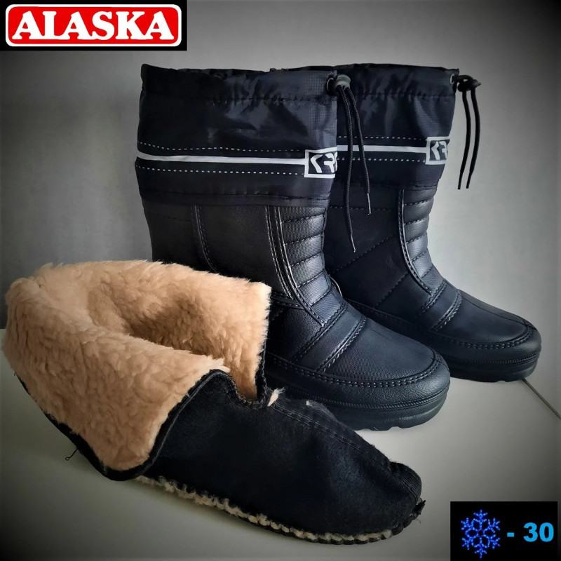 Універсальні чоловічі чоботи на холодну пору року, зимові чоботи для риболовлі, полювання, тривалого проведення часу на вулиці, походів і прогулянок. Розмір 41, 42, 43, 44, 45. Чоботи з ЕВА зі знімною вкладкою із овчини. Рибальські чоботи до -30 °C. Виробництво — Україна, експортна партія компанії Крок із биркою Alaska, яка виробляє якісне взуття спец призначення. Модель вироблена для постачання до Європи. Має фірмову етикетку. Ця модель чоловічих чобіт обладнана світловідбивною смужкою, яка гарантує безпеку під час проходження в місцях руху транспорту. Колір чорний Матеріал чобота – ЕВА + плащова тканина. Матеріал вкладки — повсть + збита овчина. Висота халяви — 28,5 см. Додатково: шнурок для утягування халяви. Зносостійкі якісні чоботи зі спіненого матеріалу ЕВА, зроблені суцільно литим способом, що гарантує тривалість носіння і прирівнює ймовірність промокання чобіт до нуля. Чоловічі чоботи з ЕВА забезпечать тепло та комфорт ваших ніг упродовж тривалого часу. ЕВА — матеріал, який не пропускає холод і вологу, не промокає, є найбільш зносостійким із собі подібних, простий у догляді та доступний за ціною. Рибальські чоботи популярні і в домашньому господарстві, є універсальним взуттям. Легко миються й миттєво висихають. Чоботи можна носити без вкладки як захист від води в теплу пору року. Під час настання осінньо-зимового періоду вкладка на основі повсті та набивної овчини забезпечить тепло та комфорт усередині чобота. Зверху є широка плащова вставка — манжета на утяжці, яка додатково перешкоджає потраплянню бруду та вологи всередину чобота. Підошва досить щільна та товста для захисту від модернозої землі та снігу, з глибоким протектором, завдяки чому чоботи не ковзають у гомілку. Такі чоловічі зимові чоботи — чудовий вибір практичних чоловіків. Вітчизняні зимові черевики на хутрі витримають найнижчі температури та залишать ноги в комфорті, сухості та теплі. Доставка виготовляється зручним вам поштовим оператором: Укр пошта, Нова пошта, Justin.