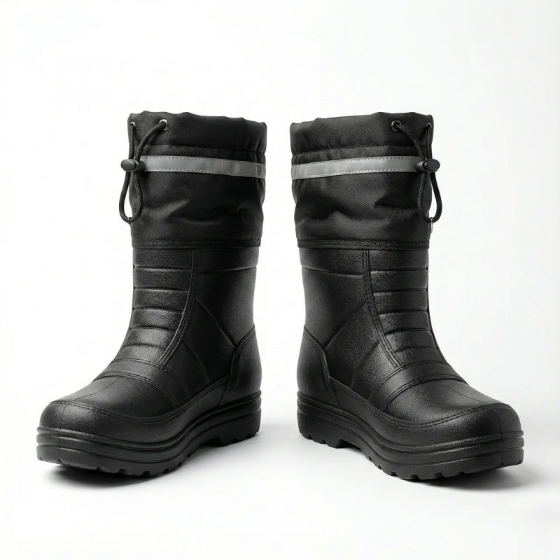 Чоботи виготовлені з якісної гуми з утепленою підкладкою, яка зберігає тепло до -30°C. М'яка манжета щільно прилягає до ноги, запобігаючи потраплянню снігу та холодного повітря. Світловідбивна смуга забезпечує безпеку в темряві.