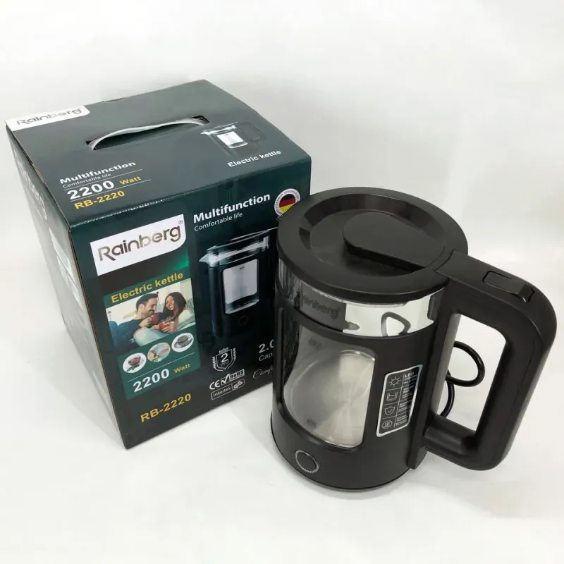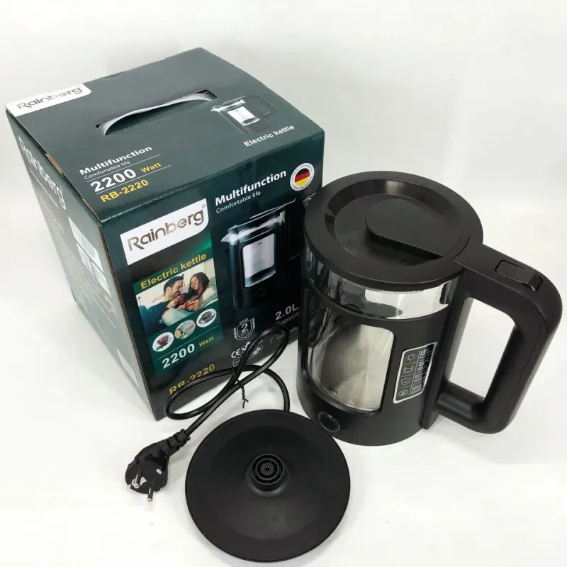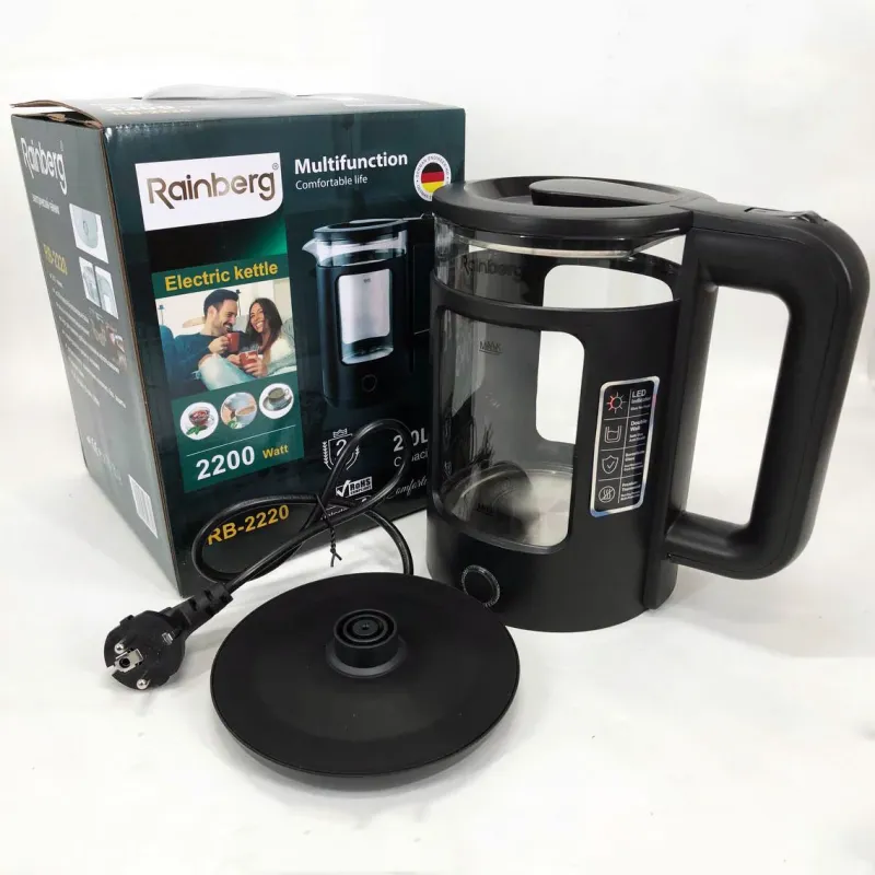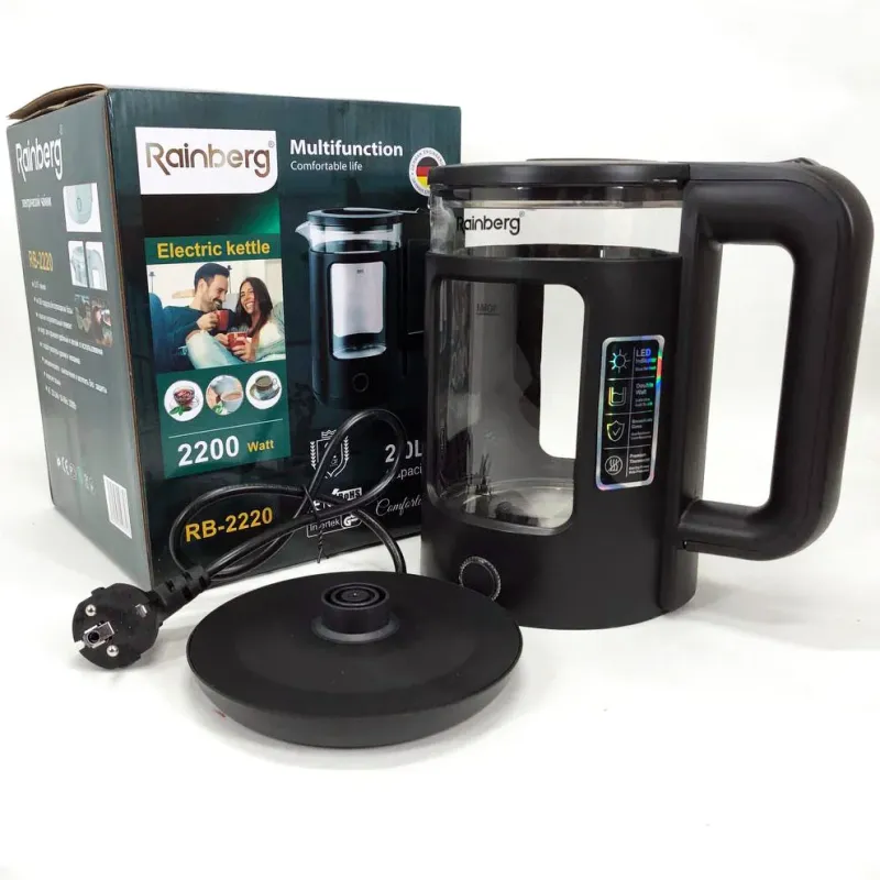 | Назва | Электрочайник Rainberg RB-2220 стеклянный, дисковый прозрачный. Чайник с подсветкой 2200W. Цвет: черный |