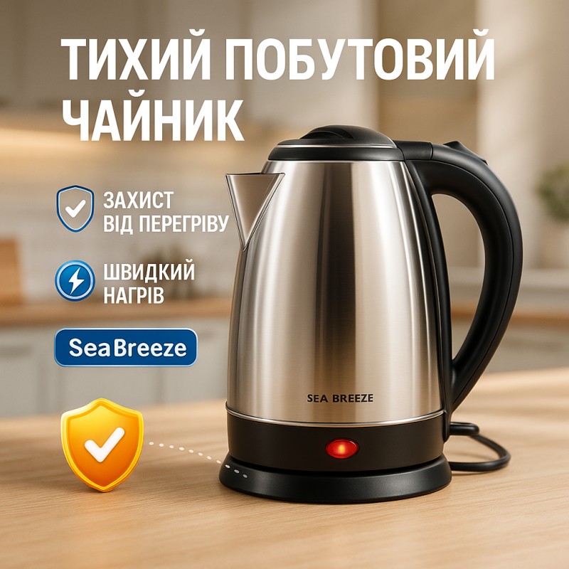 Sea Breeze SB-013 ідеально підходить для повсякденного кип’ятіння води з максимальною продуктивністю. Його потужність у 1500 Вт гарантує швидке нагрівання, дозволяючи в найкоротший термін насолоджуватись гарячими напоями зранку чи під час роботи. Вмістимість 1,8 літра робить цей чайник зручним для сімейних чаїв, приготування супів або навіть миттєвого заварювання улюбленого напою для гостей. Простота використання та сучасний дизайн роблять цей пристрій неперевершеним помічником на кухні, полегшуючи щоденне приготування гарячої води.