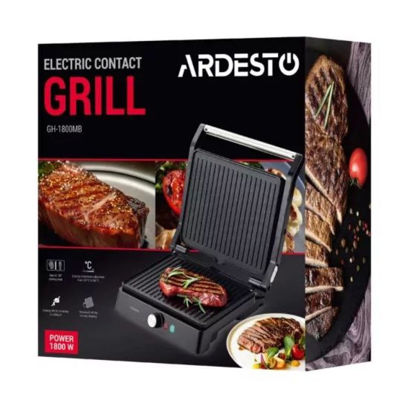 Электрогриль ARDESTO GH-1800MB Прижимной гриль ARDESTO GH-1800MB мощностью 1800 Вт и интуитивно понятным механическим управлением. Предусмотрено раскрытие на 180° и регулировку температуры. Устройство оснащено рифлеными керамическими против