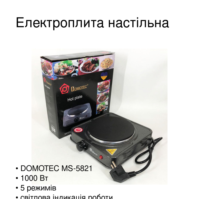 Електроплита настільна DOMOTEC MS-5821 (дискова на 1 конфорку/1Д), маленька переносна електроплита можна замовити в інтернет-магазині Shtyrman. Перевіряйте модель, виробника, наявність і характеристики перед покупкою.