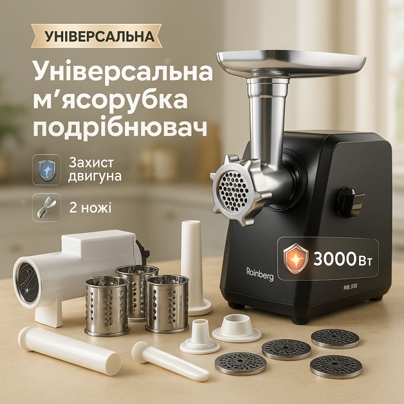 | Назва | Электрическая мясорубка Rainberg RB-673 с соковыжималкой и шинковкой 9 насадок 3000W с реверсом |