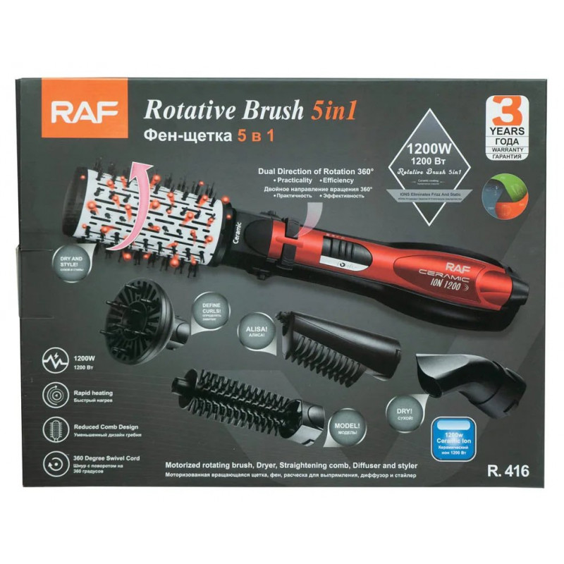 | Назва | Фен гребінець 5в1 для сушіння та укладання волосся RAF R-416, Стайлер із п’ятьма змінними насадками 1200 Вт |