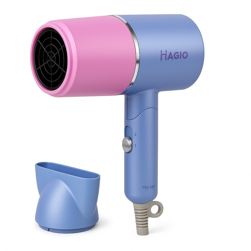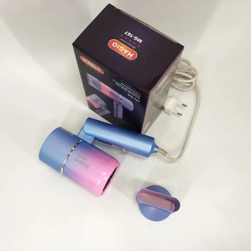 Фен MG-167 ідеально підходить для домашнього використання, забезпечуючи швидкий та якісний догляд за волоссям щодня. Завдяки компактному формату і складаній ручці цей пристрій незамінний у подорожах, бізнес-відрядженнях або на дачі. Він легко поміщається у будь-яку сумку, зберігає свої технічні характеристики при тривалому використанні і підходить для різних типів волосся, завдяки регулюванню температури та швидкості повітря.