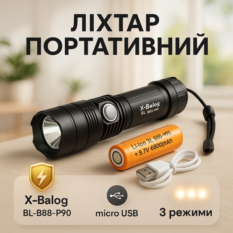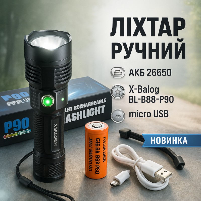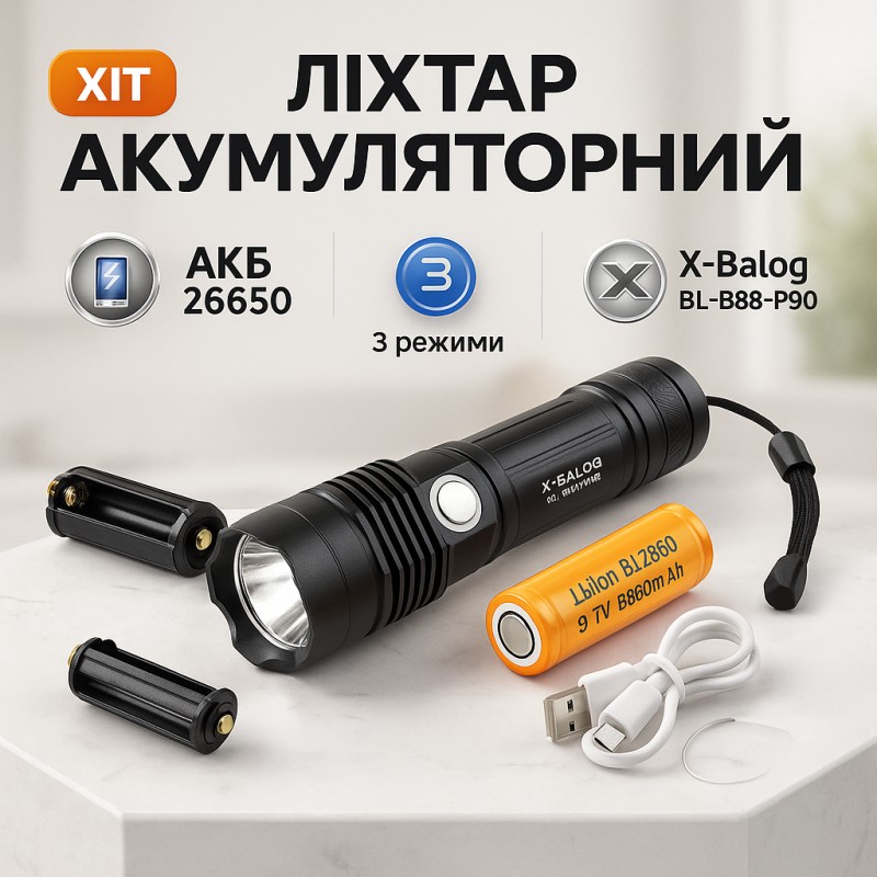 | Назва | Фонарь аккумуляторный X-Balog BL-B88-P90, яркий фонарик, качественный фонарик, мощный ручной фонарик |