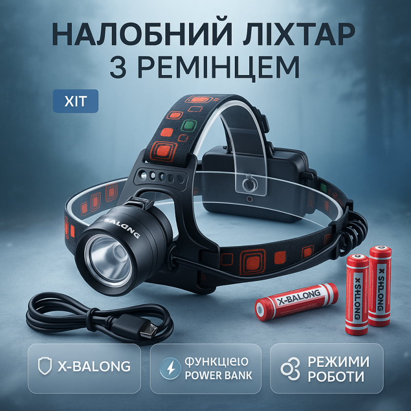 | Назва | Фонарь налобный X-Balong XQ-218-HP50 аккумуляторный LED zoom с функцией Power Bank 3 режима работы |