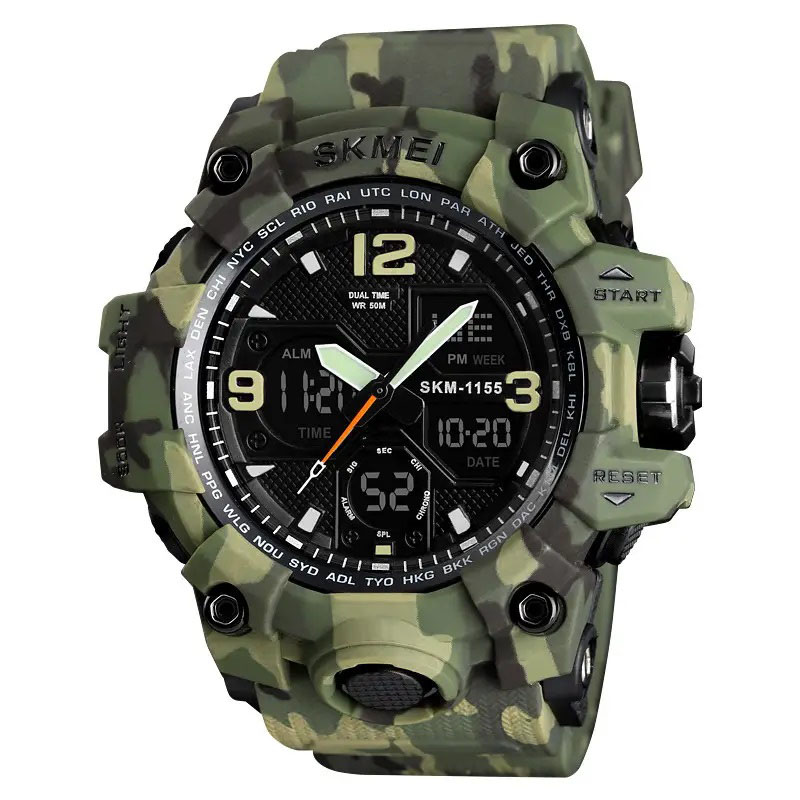 Годинник SKMEI 1155BCMGN GREEN CAMO — це стильний, брутальний аксесуар, створений для тих, хто веде активний спосіб життя та цінує надійність у кожній деталі. Завдяки маскувальному (камуфляжному) дизайну, він чудово підходить для військових, туристів, мисливців та поціновувачів тактичного стилю. Корпус виготовлений із міцного пластику, стійкого до ударів, а ремінець комфортно фіксує годинник на зап’ясті. Модель поєднує аналогову та цифрову індикацію, що додає зручності у повсякденному використанні.