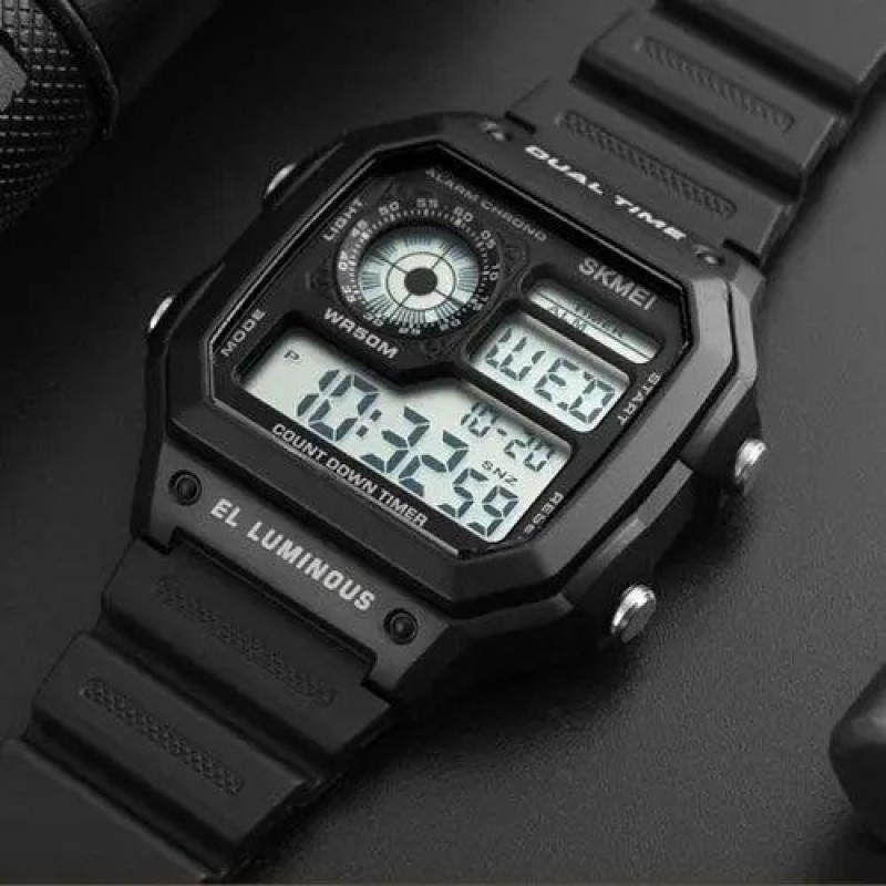 Годинник SKMEI 1299BK — це брутальна цифрова модель у ретро-дизайні, яка поєднує зручність використання з сучасною функціональністю. Прямокутний корпус з виступаючими кнопками та великим багатофункціональним дисплеєм робить годинник не лише привабливим, а й надзвичайно практичним. Чорний матовий корпус у поєднанні з класичним ремінцем надає моделі універсального вигляду, який пасує до спортивного, повсякденного або тактичного стилю.