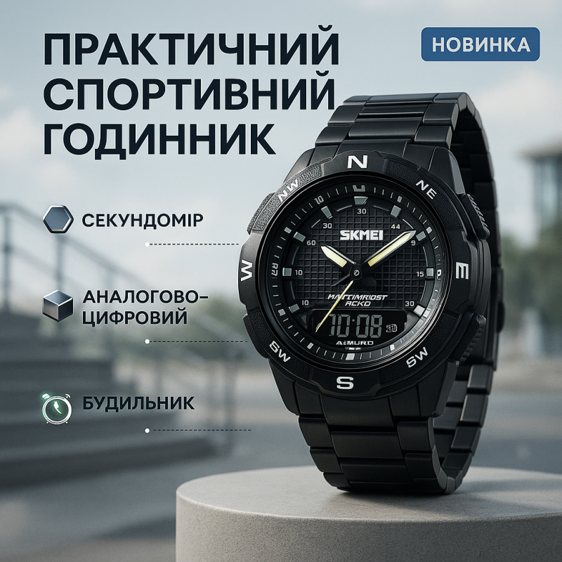 SKMEI 1370BKWT — це вдале поєднання класики та сучасної функціональності в одному стильному аксесуарі. Годинник має комбінований циферблат — аналогові стрілки гармонійно поєднуються з цифровим екраном, забезпечуючи максимальну зручність у використанні. Металевий браслет чорного кольору додає моделі солідності та робить її універсальною — як для офісного дрес-коду, так і для активного способу життя.