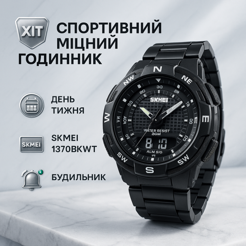 | Назва | Годинник наручний чоловічий SKMEI 1370BKBK, годинник для військовослужбовців, фірмовий спортивний годинник |