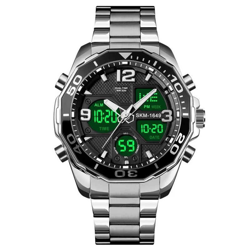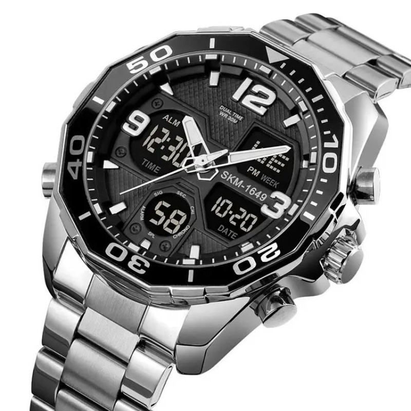 SKMEI 1649SB — це сучасний чоловічий годинник із масивним сталевим браслетом та ефектним багатофункціональним циферблатом. Сріблястий корпус у поєднанні з чорними елементами створює стильний контраст, що підкреслює спортивний характер моделі. Великі індекси, виразний безель і деталізований дизайн надають годиннику солідного та впевненого вигляду.