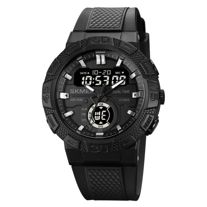 Годинник SKMEI 1881BKBK — це мужній аксесуар із насиченим функціоналом і агресивним спортивним дизайном. Чорний матовий корпус з текстурованим безелем та масивними мітками створює брутальний вигляд, який підкреслює рішучий стиль власника. Завдяки поєднанню аналогової і цифрової індикації, ви завжди матимете доступ до ключової інформації в зручному форматі.