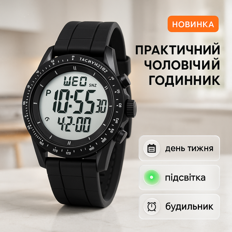Годинник оснащений всіма необхідними функціями для щоденного використання: будильник, секундомір, таймер і підсвітка для зручності в темний час доби. Функція автоматичного календаря та індикація дня тижня роблять його ще більш практичним. Цей аксесуар ідеально підходить для тих, хто шукає баланс між функціональністю та стильним зовнішнім виглядом.