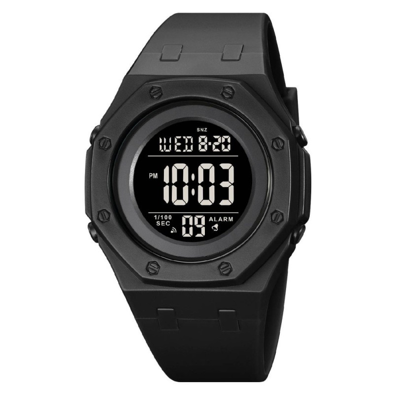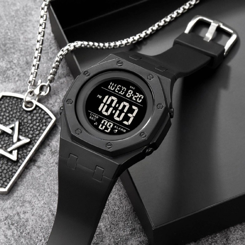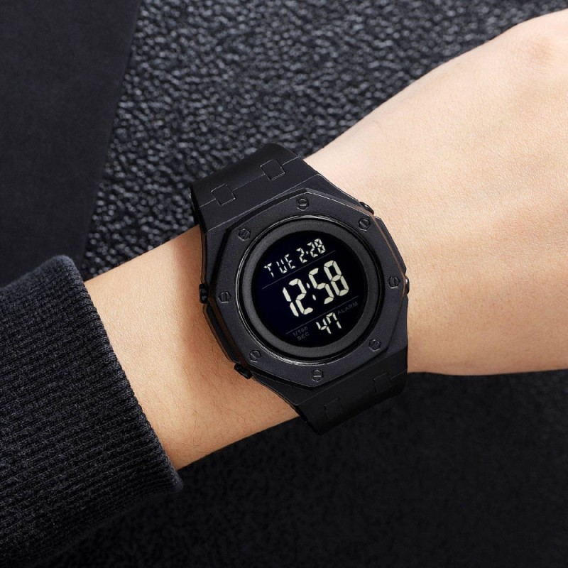 SKMEI 2048BKBK — це втілення лаконічного дизайну в сучасному цифровому виконанні. Повністю чорний корпус у поєднанні з матовим ремінцем створює стриманий і водночас агресивний образ, що ідеально підходить як для міського стилю, так і для активного способу життя. Дисплей з інверсною підсвіткою додає годиннику технологічності та підкреслює його характер.
