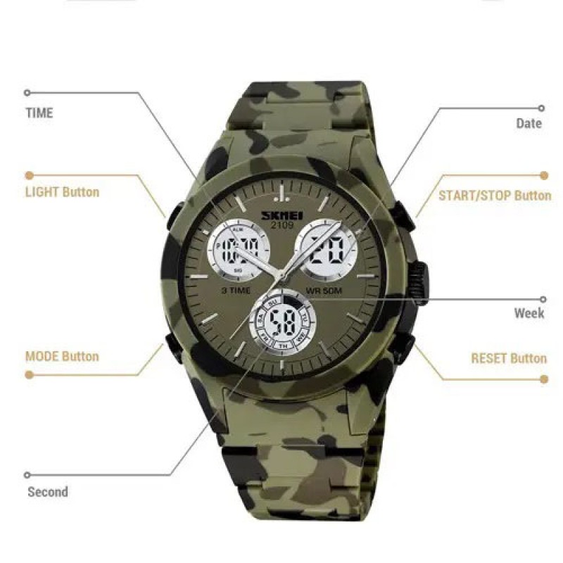 SKMEI 2109CMGN — це годинник, що створений для тих, хто не боїться виділятися. Його камуфляжний корпус і ремінець роблять цей аксесуар ідеальним для поціновувачів військового стилю або активного способу життя. Завдяки унікальному дизайну й поєднанню аналогового та цифрового дисплеїв, модель виглядає сучасно та функціонально.