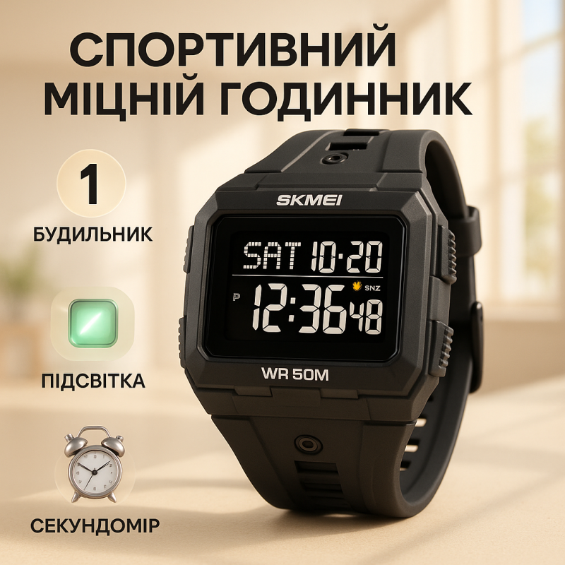 SKMEI 2186BKBK — це цифровий годинник у класичному чорному виконанні, який поєднує простоту, надійність і сучасну функціональність. Його стриманий вигляд гармонійно підходить як для міського стилю, так і для активного способу життя. Матовий корпус із квадратним дисплеєм виглядає стильно та при цьому залишається максимально практичним.
