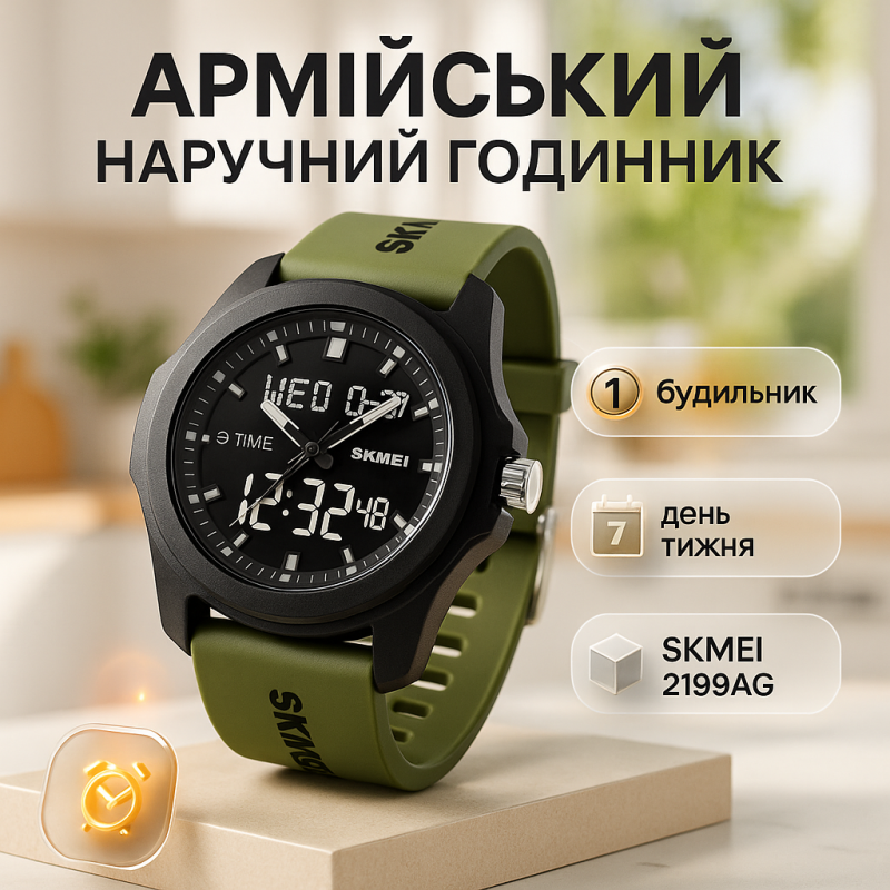 Годинник SKMEI 2199AG — це поєднання сучасного дизайну та функціональності, яке ідеально підходить для активного способу життя. Завдяки потужному корпусу та стильному ремінцю кольору хакі, модель виглядає мужньо та лаконічно, що робить її доречною як для повсякденного носіння, так і для спортивних занять. Вбудований аналогово-цифровий дисплей дозволяє легко контролювати час у будь-яких умовах, включаючи темну пору доби.