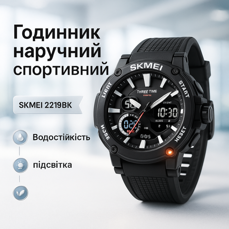 Годинник дозволяє контролювати одразу три часові зони, має набір корисних функцій, серед яких таймер зворотного відліку, секундомір, будильник, автоматичний календар і LED-підсвітка. SKMEI 2219BK ідеально підійде тим, хто шукає надійний аксесуар для спорту, подорожей або повсякденного носіння. Водозахист 50M дозволяє не знімати його під час дощу чи активних занять.