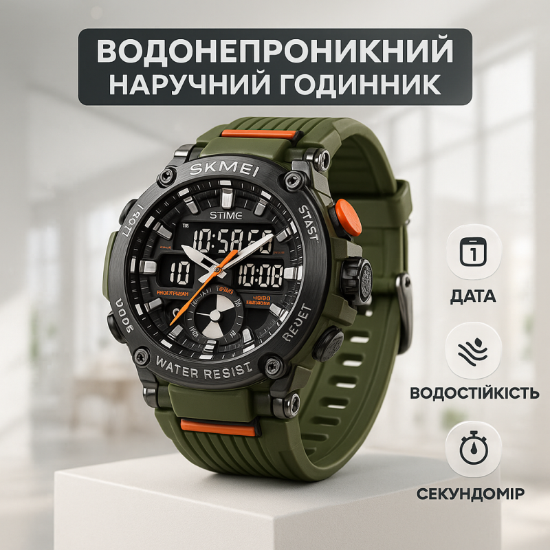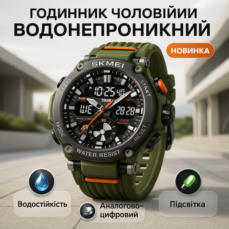 SKMEI 2223AG — це брутальний та функціональний чоловічий годинник, створений для екстремальних умов та активного стилю життя. Його агресивний дизайн поєднує в собі корпус з металевими вставками, армований зелений ремінець та яскраві елементи управління, які додають годиннику характеру. Візуально модель виглядає потужно і при цьому має зручну компоновку дисплеїв — аналогових та цифрових.