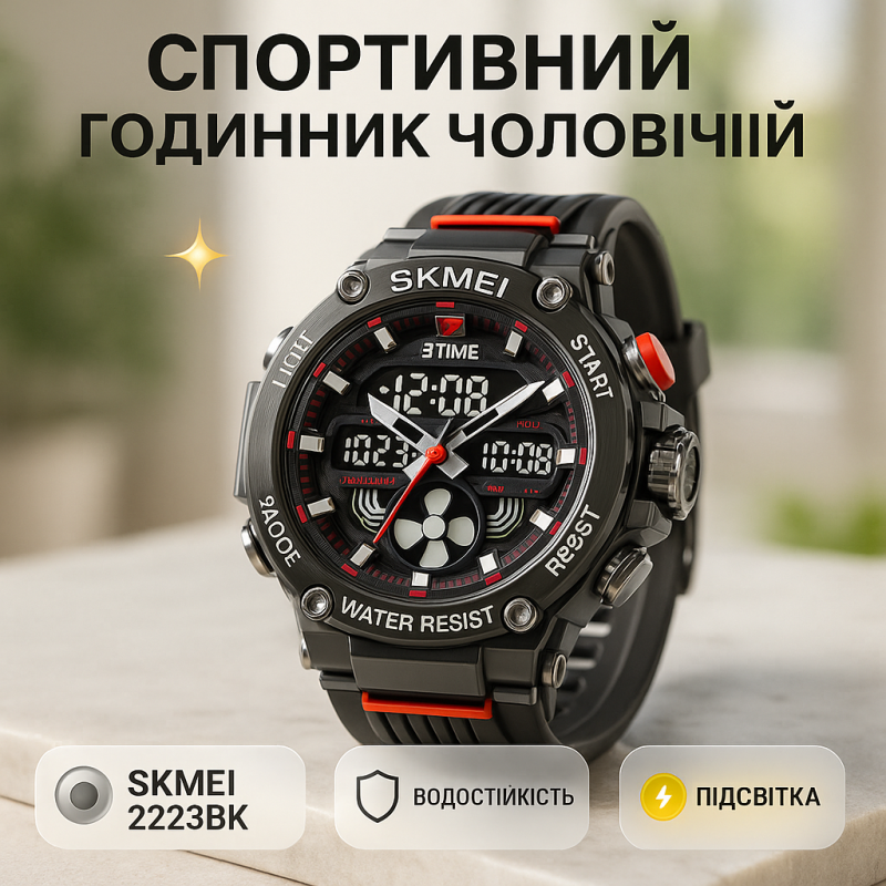 Годинник ідеально підходить для активного способу життя, тренувань, туризму або просто як аксесуар на кожен день. SKMEI 2223BK оснащений трьома часовими зонами, будильником, секундоміром, таймером, автоматичним календарем і LED-підсвіткою. Завдяки водозахисту до 50 метрів, годинник не боїться води й витримує інтенсивне використання у будь-яких умовах.