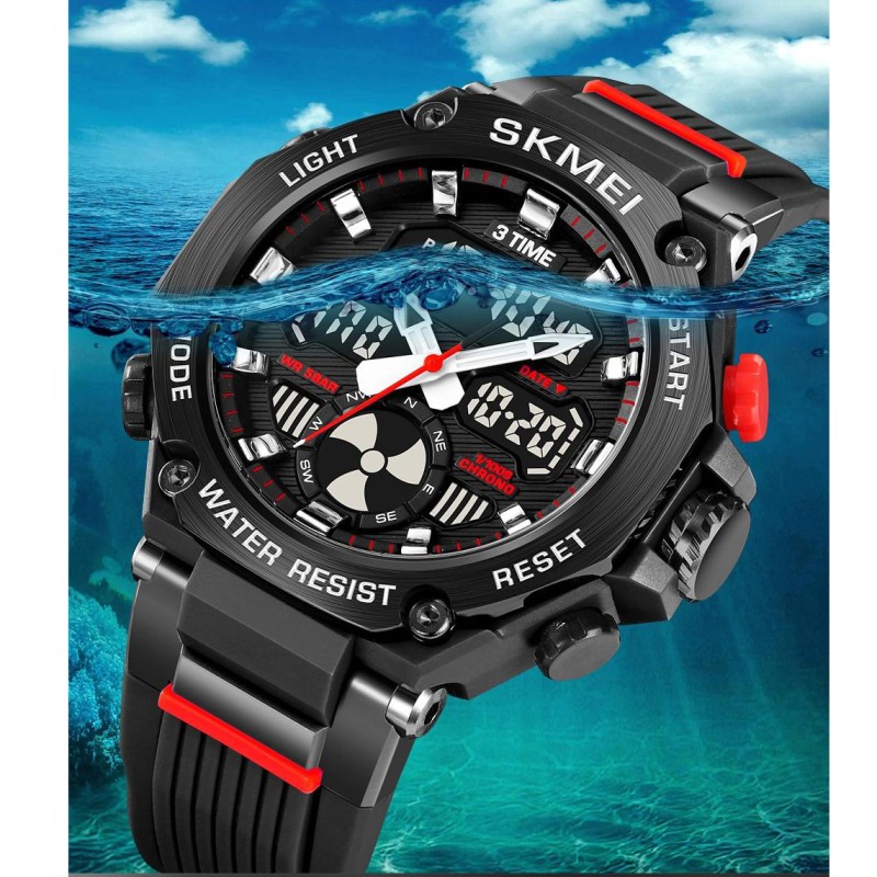 SKMEI 2223BK — це яскравий спортивний годинник із характером, який точно не залишиться непоміченим. Завдяки виразному дизайну з червоними елементами, металевими деталями корпусу та поєднанню аналогового і цифрового дисплея, ця модель виглядає потужно та технологічно. Масивний корпус і брутальні кнопки підкреслюють його стиль, а зручне розташування екранів забезпечує швидкий доступ до всіх функцій.