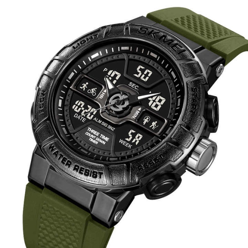 SKMEI 2227AG — це сучасний спортивний годинник із брутальним дизайном, який ідеально поєднує стиль та функціональність. Його агресивний зовнішній вигляд з масивним корпусом та оливковим ремінцем одразу привертає увагу. Великий циферблат з графічними і цифровими елементами дозволяє легко орієнтуватися у функціях навіть під час інтенсивного тренування або подорожі.