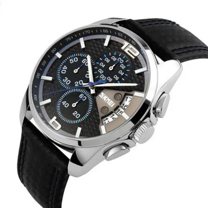Годинник SKMEI 9106BU — це стильний аксесуар для тих, хто цінує поєднання спортивного духу та класичного вигляду. Чорний циферблат із гексагональним тисненням і синіми деталями створює сучасний, динамічний образ. Три додаткові міні-циферблати відображають секундомір, хвилини та години, забезпечуючи зручний контроль часу. Шкіряний ремінець з тисненням і синьою строчкою підкреслює індивідуальність моделі та зручно фіксується на зап’ясті.