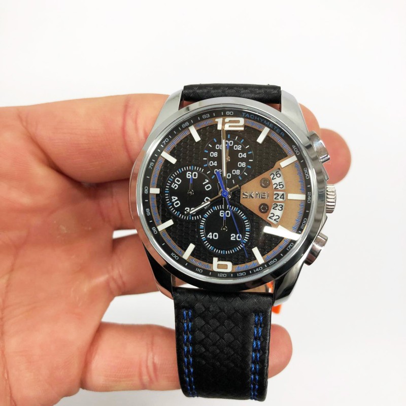 Модель SKMEI 9106BU вирізняється багатофункціональністю — вона має не лише хронограф, а й віконце з датою. Стрілки та мітки покриті світловідбивним шаром, що дозволяє бачити час у темряві. Завдяки захищеному корпусу з нержавіючої сталі та водонепроникності до 30 метрів, годинник підходить як для щоденного носіння, так і для активного відпочинку.
