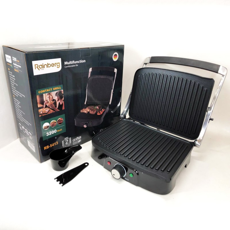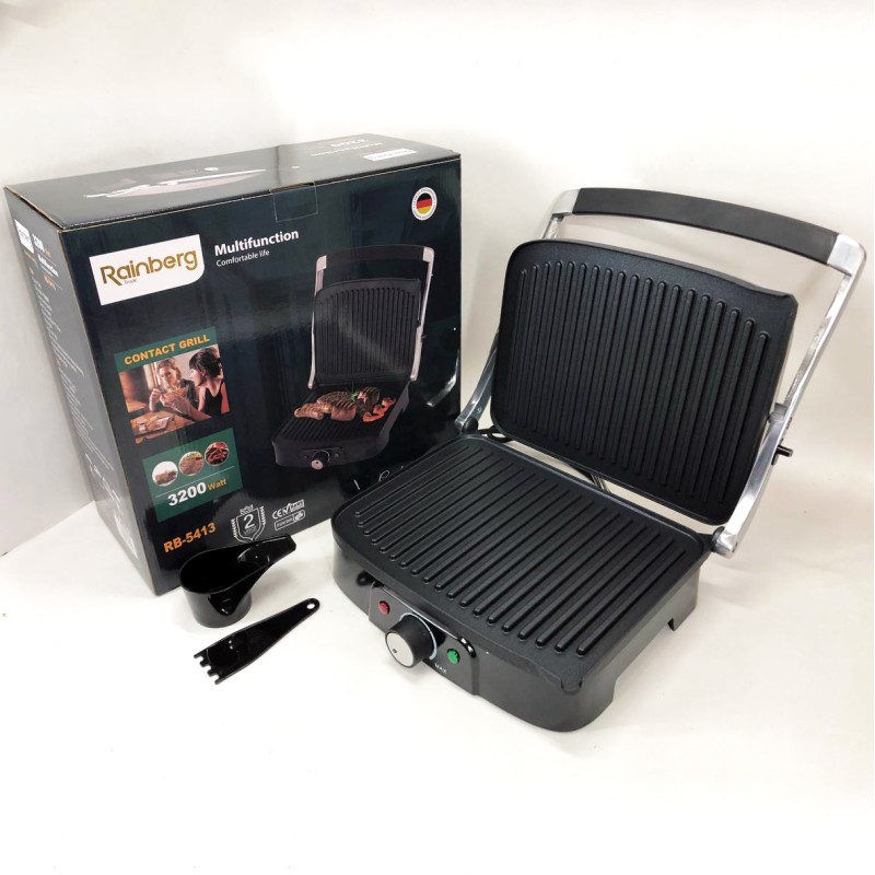 | Назва | Гриль притискний Rainberg RB-5413 терморегулятор антипригарний 3200 Вт нержавіюча сталь |