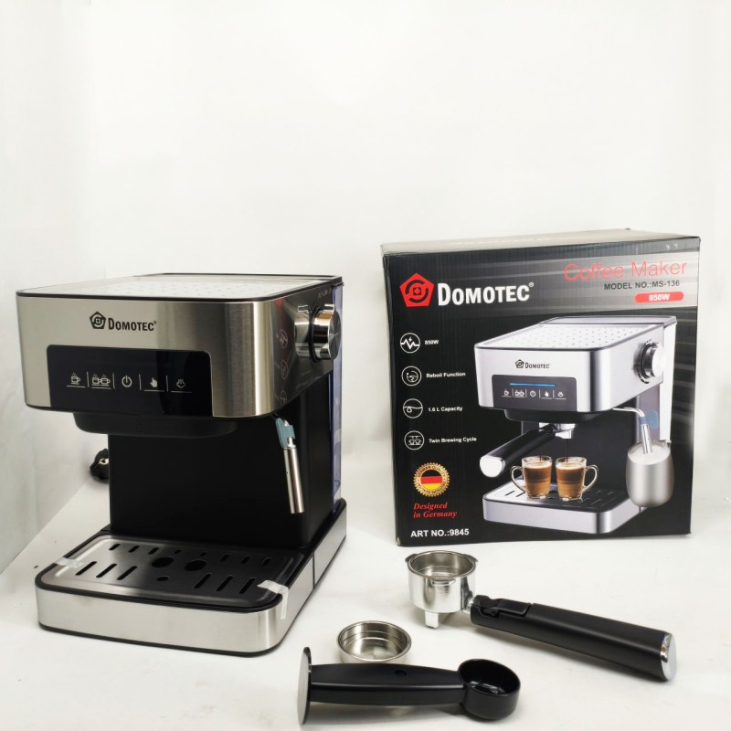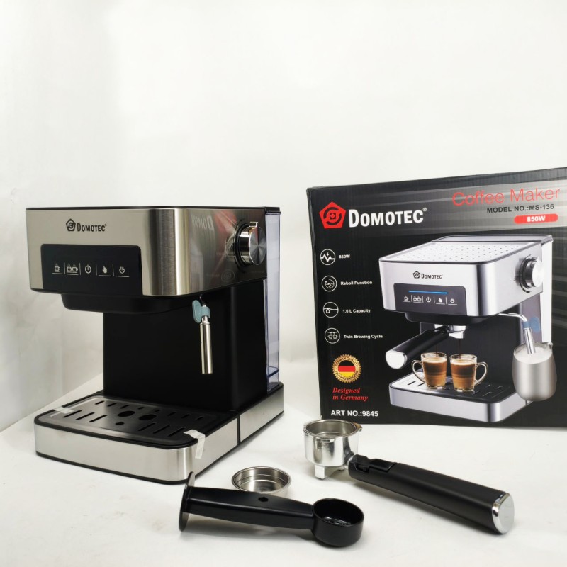 Domotec MS-136 – багатофункціональна кавоварка, яка дозволяє готувати класичний еспресо, капучино з густою молочною пінкою та інші кавові напої з мелених зерен. Прилад має потужність 850 Вт і працює під тиском 15 бар, що гарантує правильну екстракцію та смак кави.