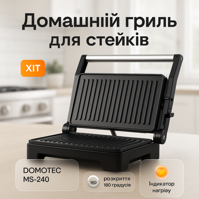 Domotec MS-240 ідеально підходить для приготування різноманітних страв швидко та без зайвого жиру. Ви можете готувати соковите мʼясо зі скоринкою, ніжну рибу, підсмажувати овочі, а також робити гарячі бутерброди для сніданку чи перекусу. Антипригарне покриття дозволяє готувати без додавання олії, що робить їжу менш калорійною і здоровішою. Зручно використовувати у будинку, офісі, на дачі та під час виїздів, де потрібне компактне та продуктивне рішення для приготування їжі.