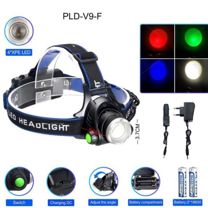 Ліхтар на голову моделі PLD V9-F-4XPE (RGB) оснащений чотирма світлодіодами різних кольорів, що відкриває широкі можливості для освітлення в різних умовах. Кожен із цих світлодіодів може випромінювати світло різних кольорів: червоний, зелений, синій та інші.