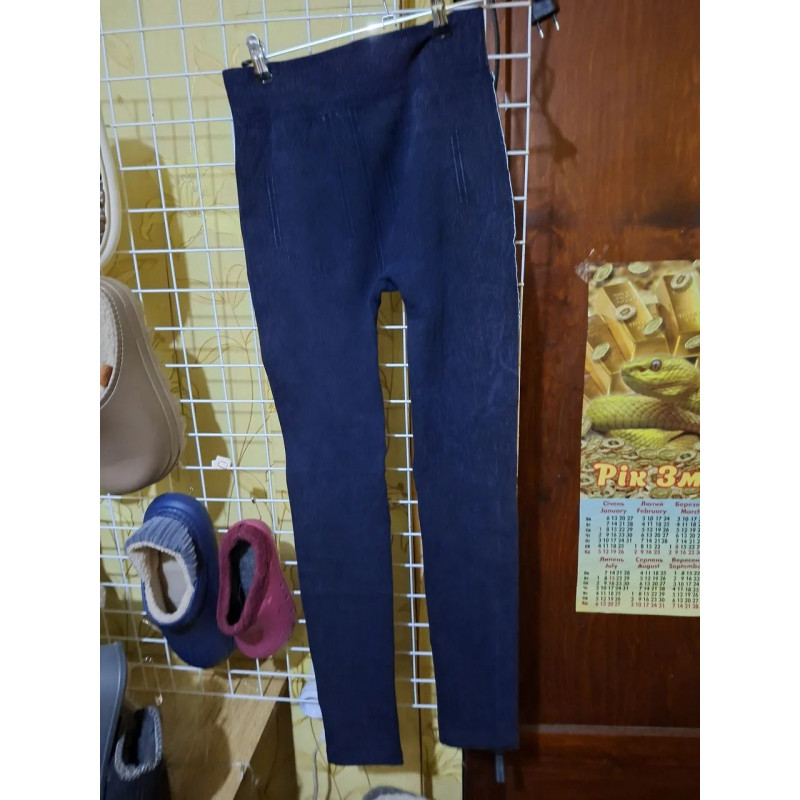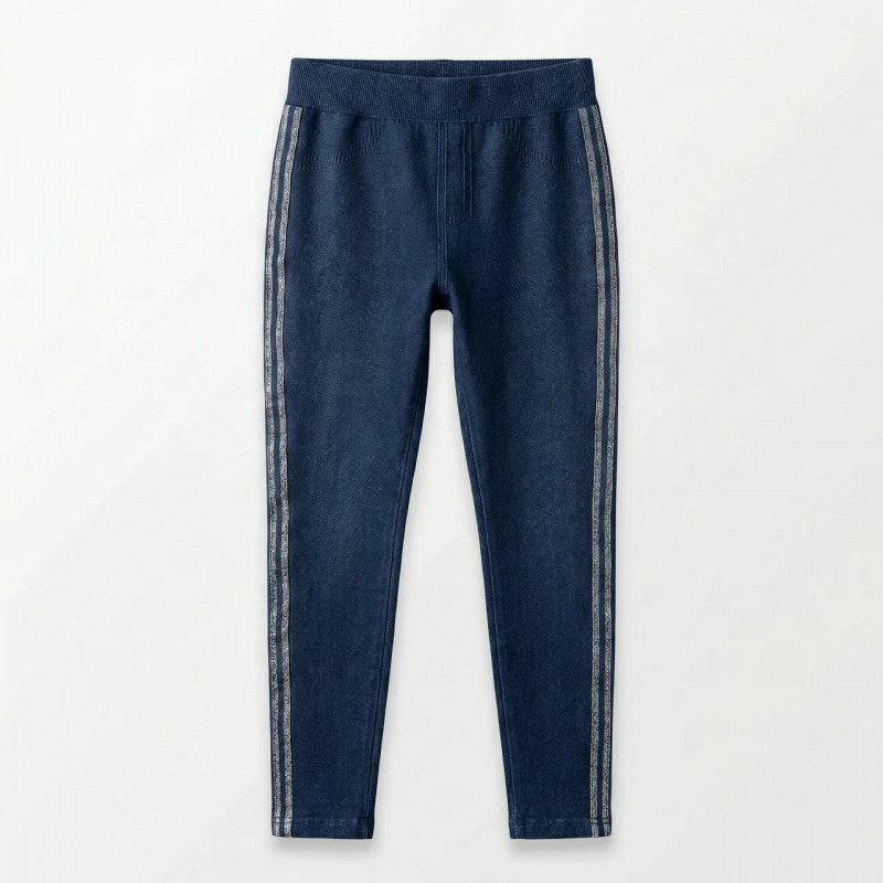 Стильні та неймовірно зручні жіночі лосини (джеггінси), які поєднують у собі комфорт трикотажних легінсів та зовнішній вигляд джинсів. Ця модель виготовлена з еластичного стрейчевого матеріалу, який ідеально сідає по фігурі, підкреслюючи силует, але не сковує рухів. Головна "родзинка" моделі — блискучі лампаси (смужки) з боків, які візуально видовжують ноги та додають образу спортивного шику. Тканина має фактуру, що імітує джинс (у синьому кольорі) або класичний меланж (у сірому), при цьому вона м'яка і приємна до тіла. Широкий еластичний пояс забезпечує комфортну посадку на талії та легкий стягуючий ефект. Це ідеальний вибір для повсякденного носіння, прогулянок або відпочинку вдома. Характеристики: Тип: Лосини-джеггінси / Легінси Матеріал: Стрейч (поліамід/бавовна/еластан) — добре тягнеться Декор: Лампаси (срібляста смужка збоку) Кольори: Синій (під джинс), Сірий Розміри в наявності: 46, 48 (універсальний M-L) Сезон: Весна / Осінь