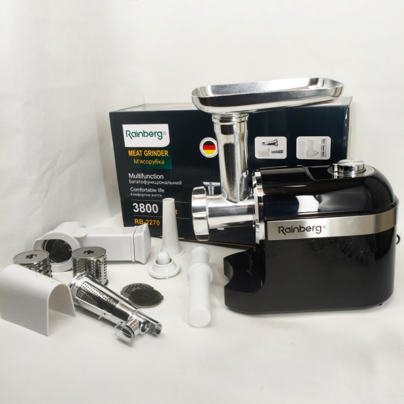 Електрична м'ясорубка Rainberg - призначена для виготовлення фаршу з м'яса, риби, грибів, нарізів овочів та фруктів, профілактика пільгового та пельменного тіста. М'ясорубка Rainberg надійна в роботі і компактна з гарним дизайном, який чудово буде вписуватися в кухню. , передбачено режим зворотного обертання шинки.